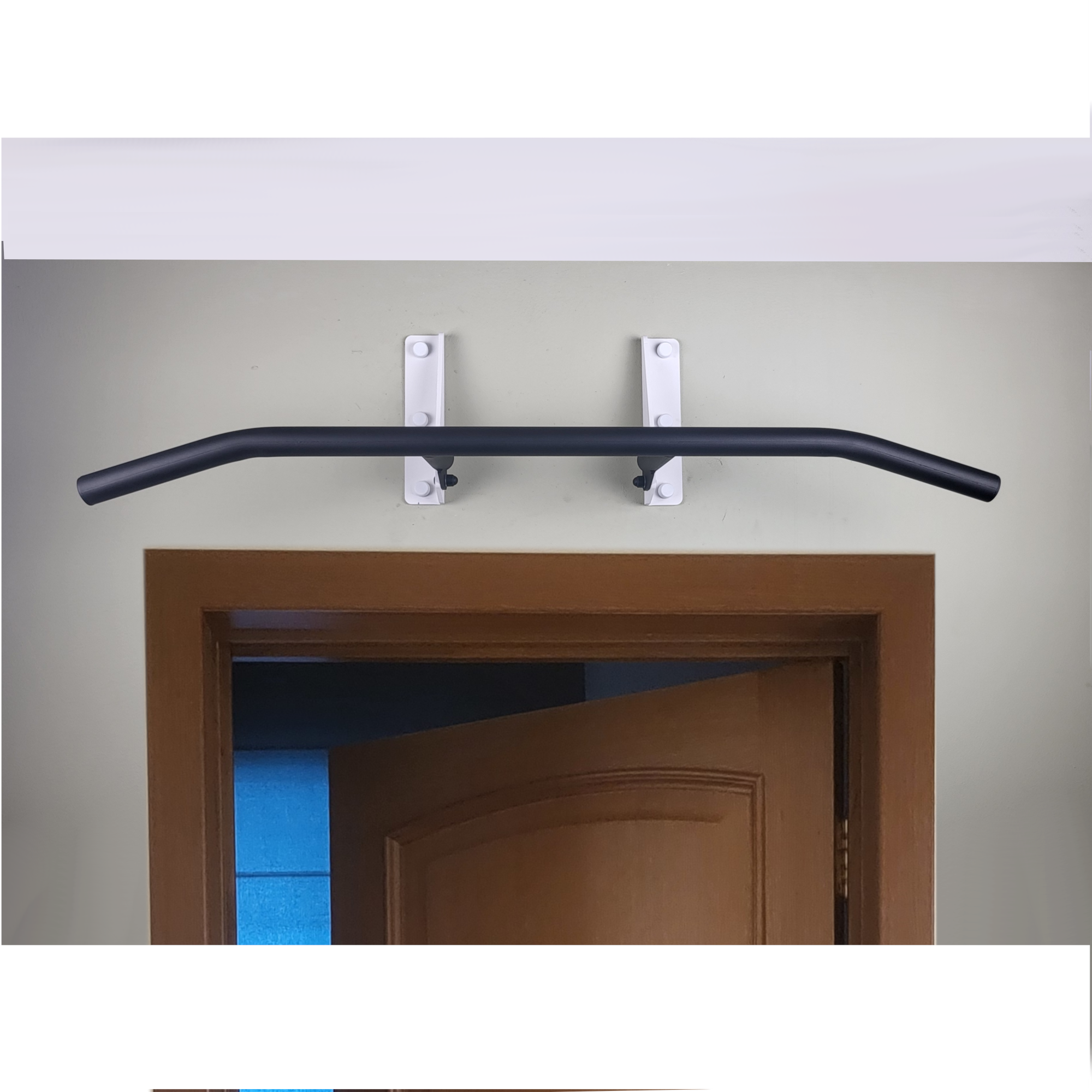 Купить Турник наддверный IronWall PRO модель D1 4-00 c чёрной перекладиной для трех хватов и белыми кронштейнами крепления к стене.