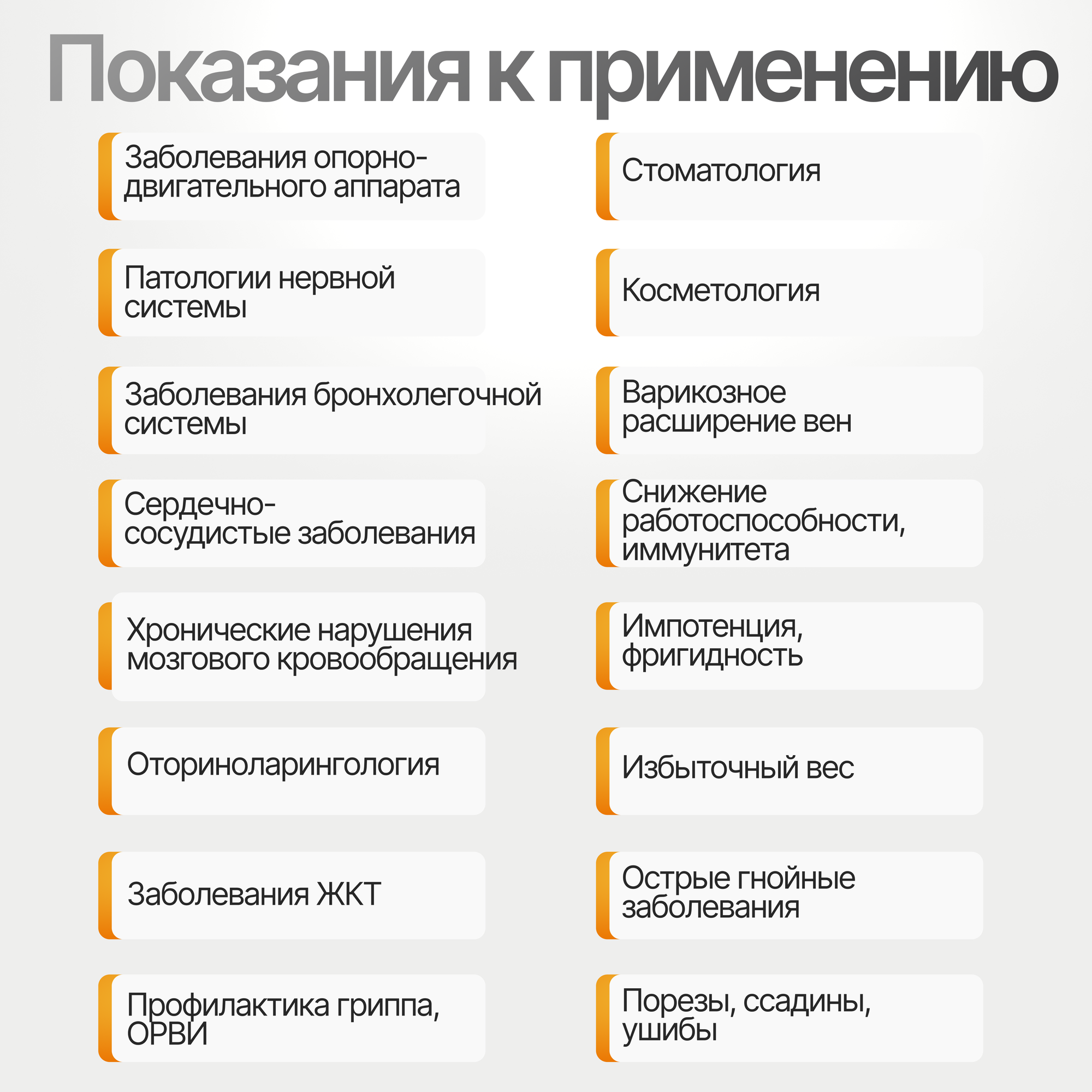 | Показания к применению | при заболеваниях «Ухо-Горло-Нос»; при заболеваниях бронхолегочной системы; при лечении травм; при лечении опорно-двигательного аппарата; при хирургических патологиях; при патологиях нервной системы. |
