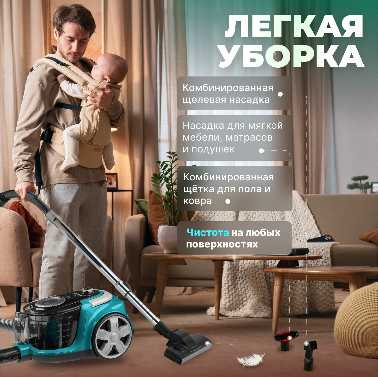 | В комплекте | насадка для ламината и паркета, насадка для мягкой мебели, универсальная насадка для сухой уборки, щелевая насадка |