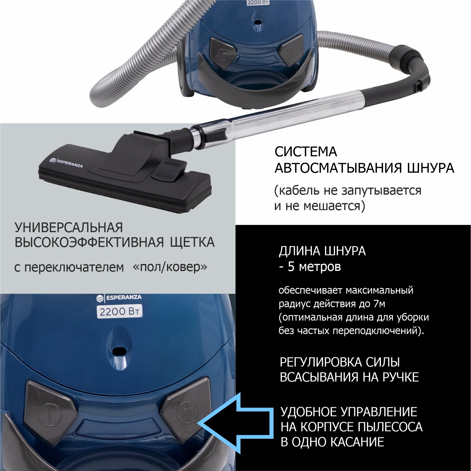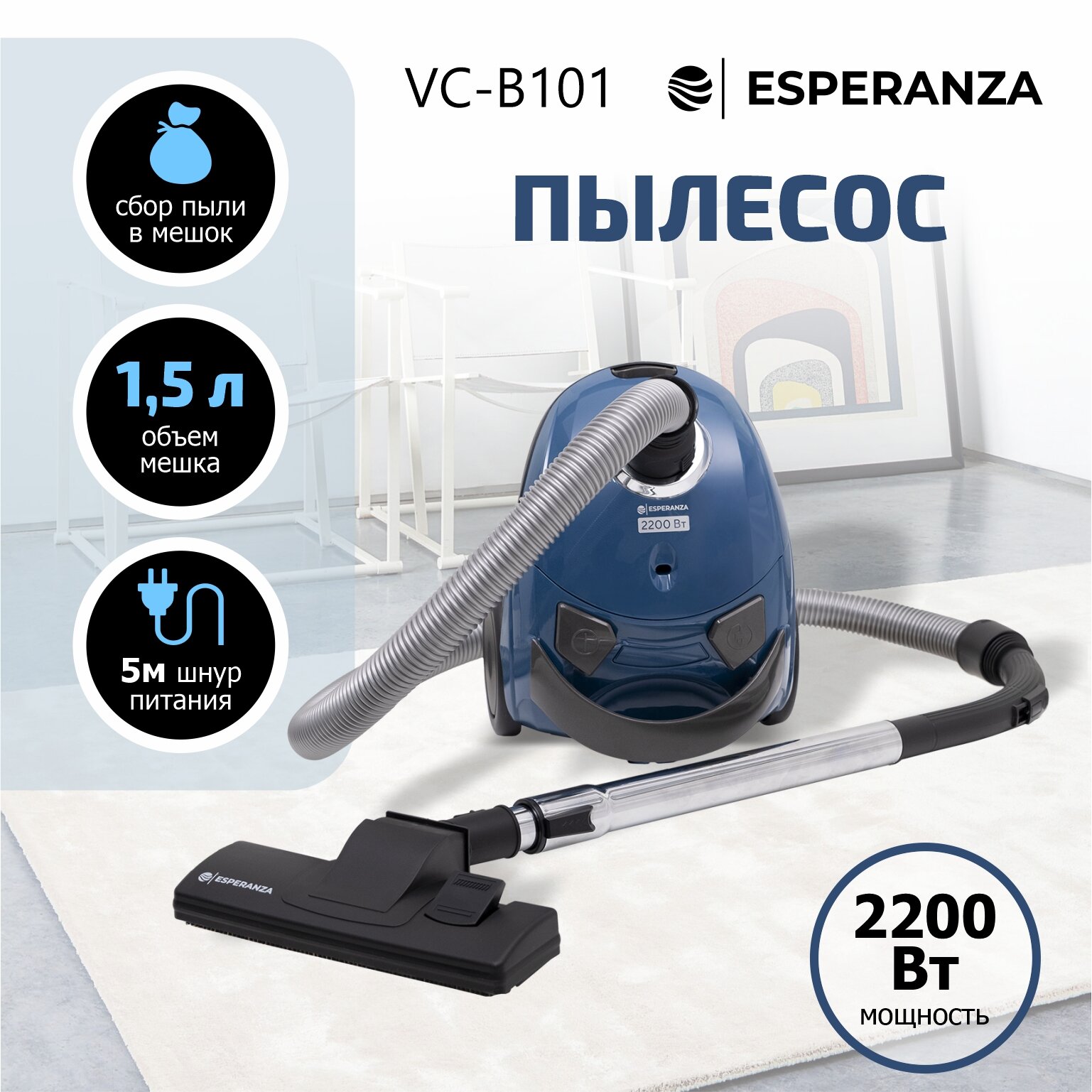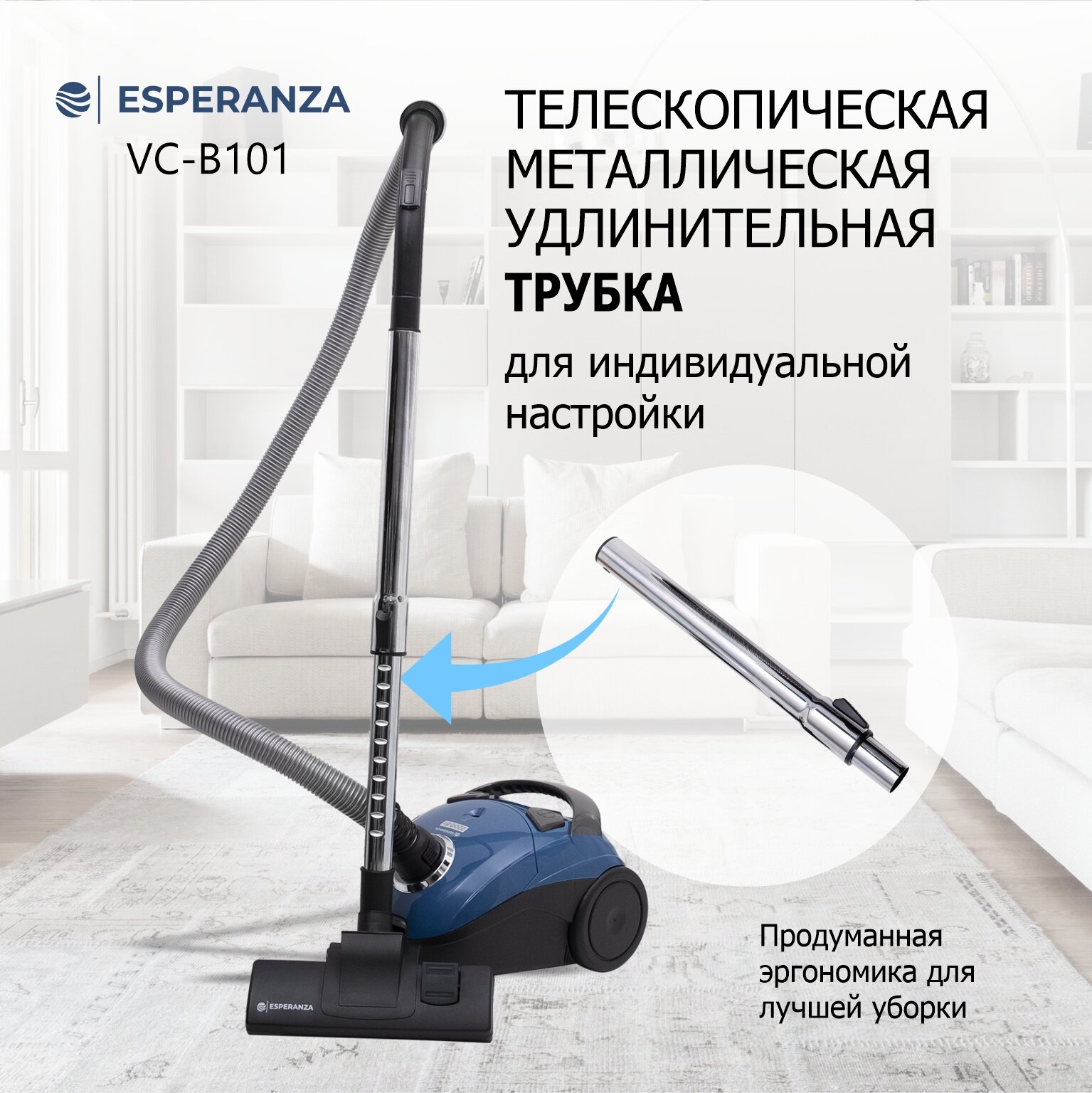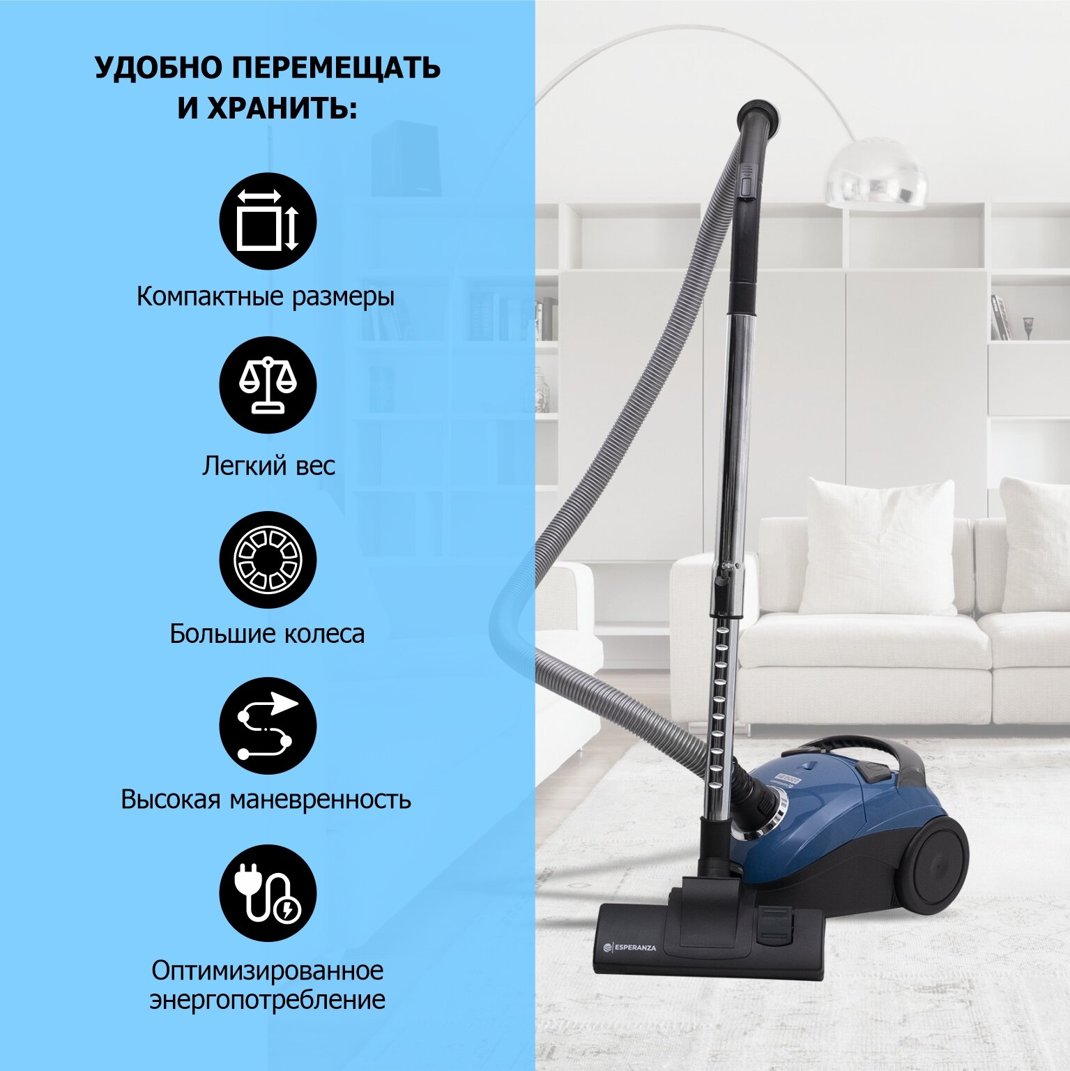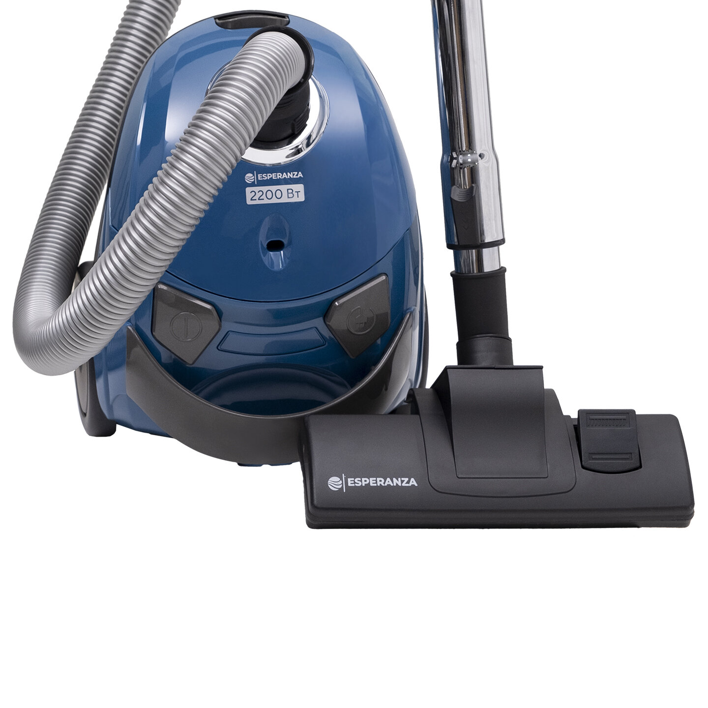 Пылесос для дома бытовой ESPERANZA VC-B101- с мешком на 1,5 литра, мощностью 2200w, шнуром длиной 5м и с 2 насадками. Цвет: синий.