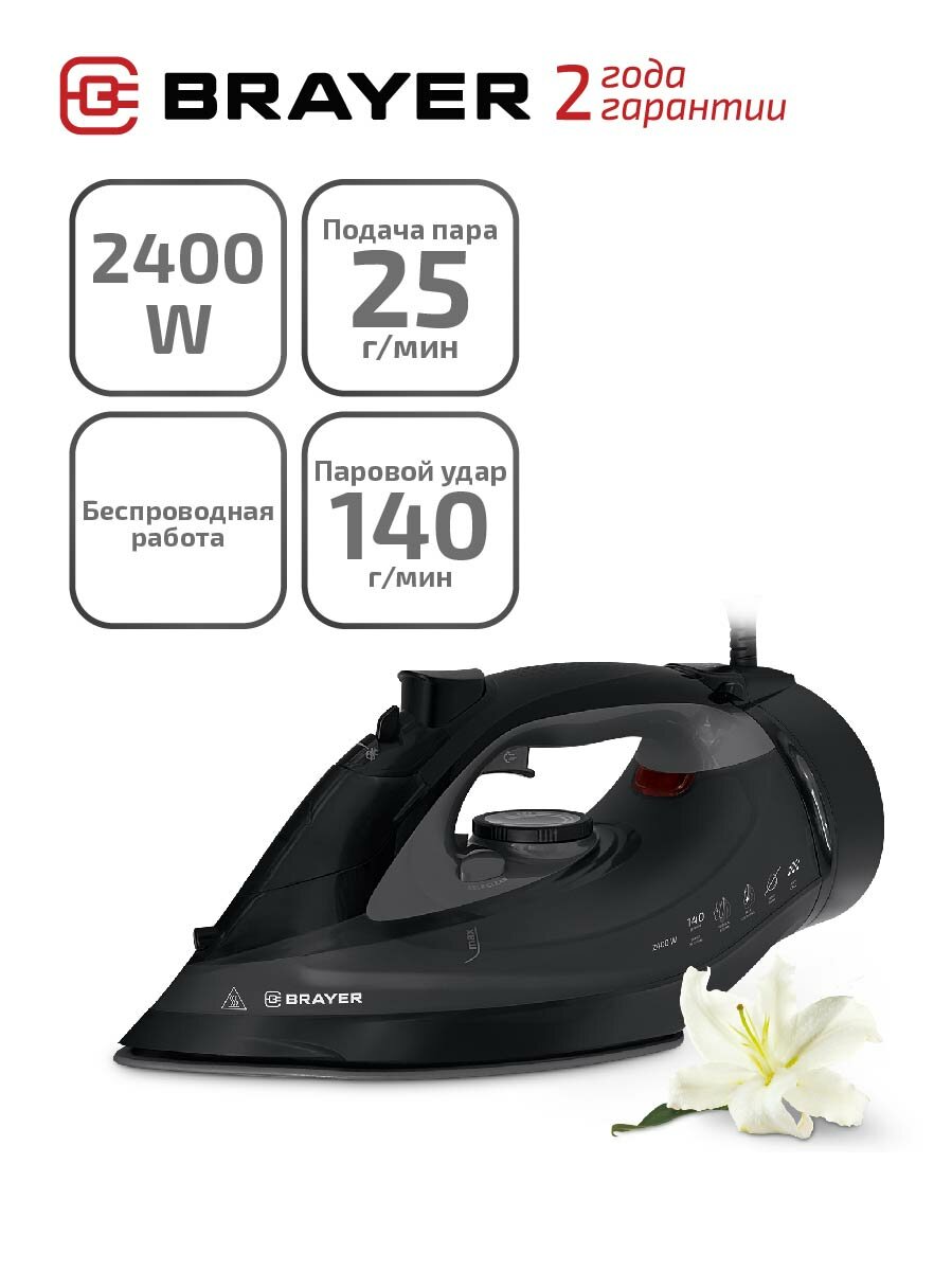 Утюг Беспроводной паровой Brayer BR4015, 2400 Вт, 300 мл, 140г/мин, керамическая подошва, самоочистка, черный