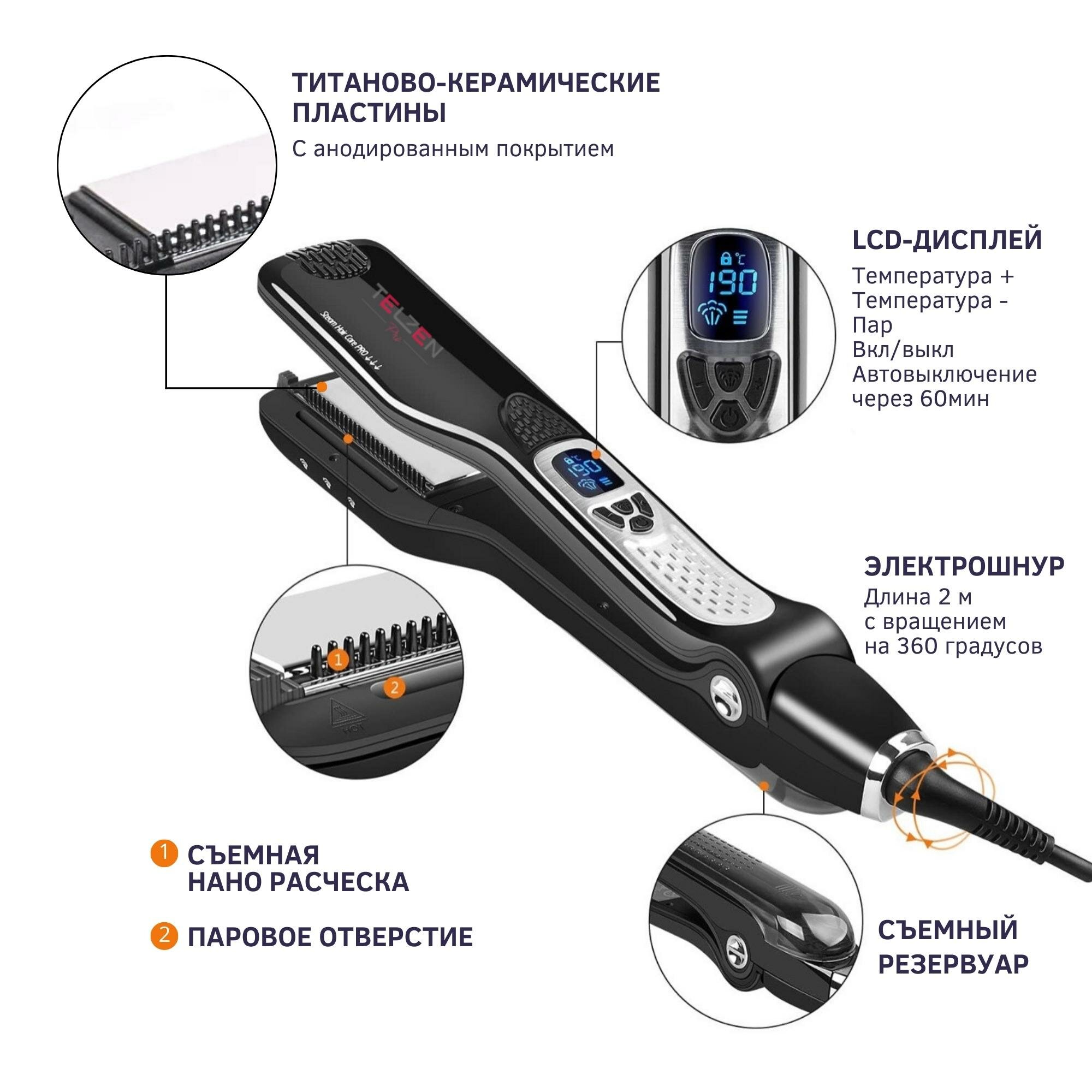 Паровой выпрямитель TELZEN для волос, 5 режимов, титановое покрытие, черный