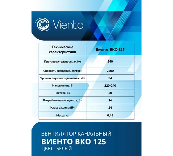 Вентилятор вытяжной канальный, Viento, установочный диаметр 125 мм, 18 Вт, 240 м³/ч, ВКО125 интересное: