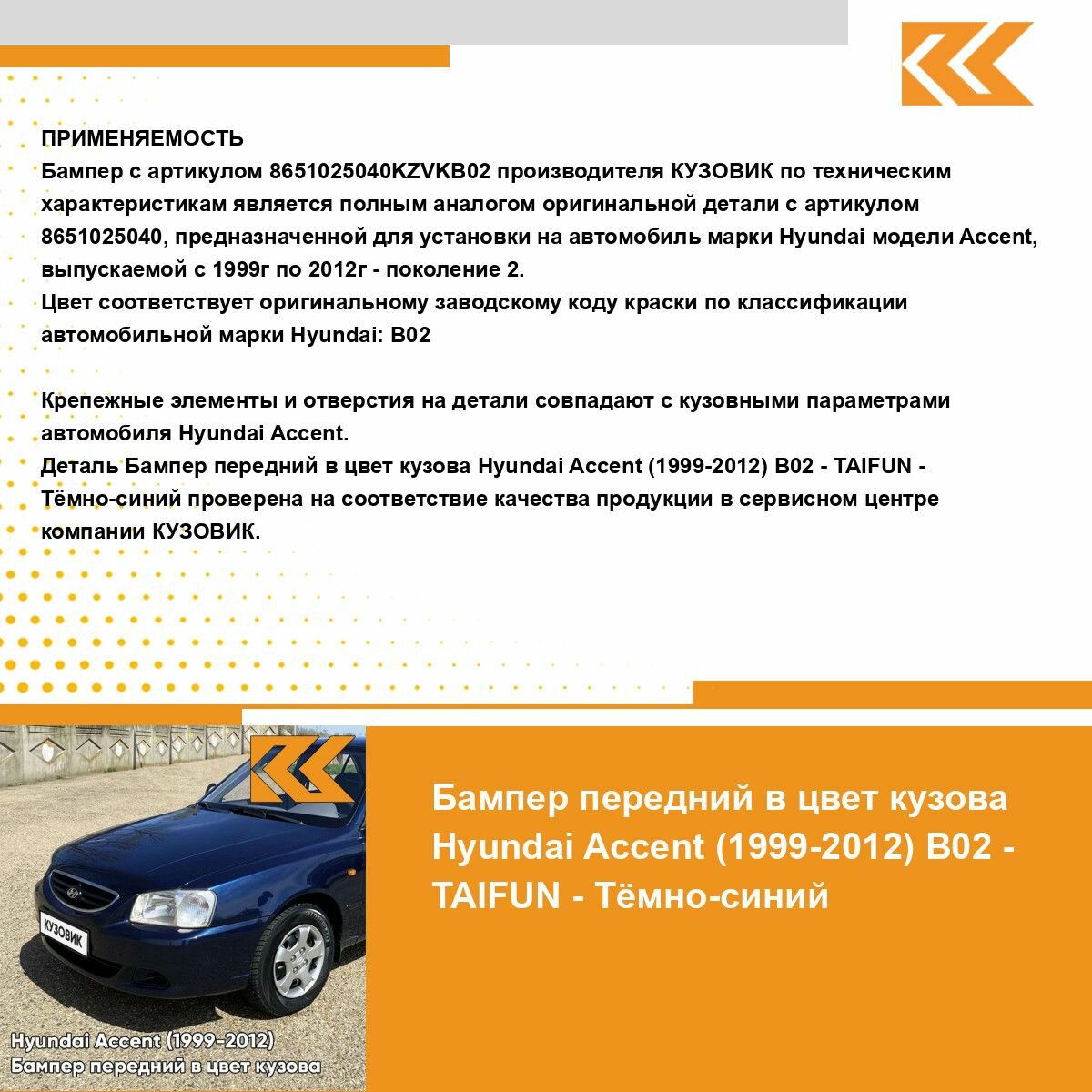 СохранитьБампер передний в цвет кузова для Хендай Акцент Hyundai Accent (1999-2012) B02 - TAIFUN - Темно-синий интересное: