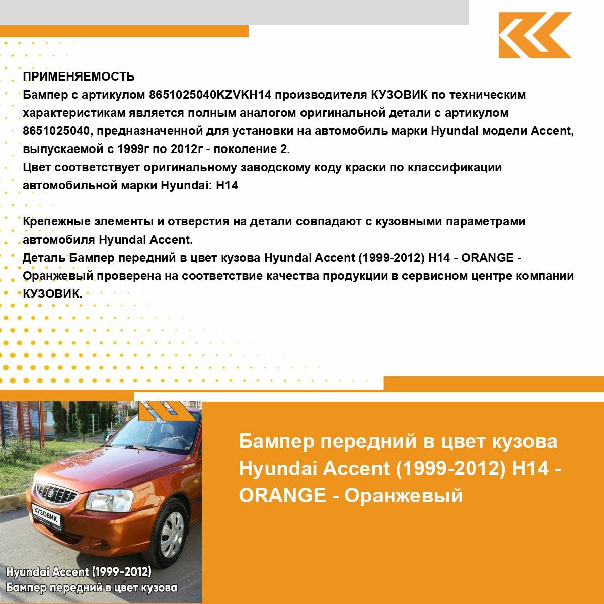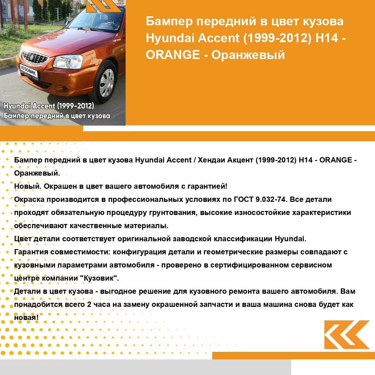 СохранитьБампер передний в цвет кузова для Хендай Акцент Hyundai Accent (1999-2012) H14 - ORANGE - Оранжевый интересное: