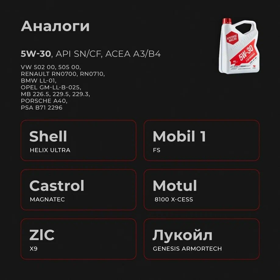 | Допуски OEM | BMW Longlife-01 / FIAT 9.55535-N2 / MB 226.5 / MB 229.3 / MB 229.5 / PORSCHE A40 / PSA B71 2296 / Renault RN 0700 / Renault RN 0710 / VW 502.00/505.00 |