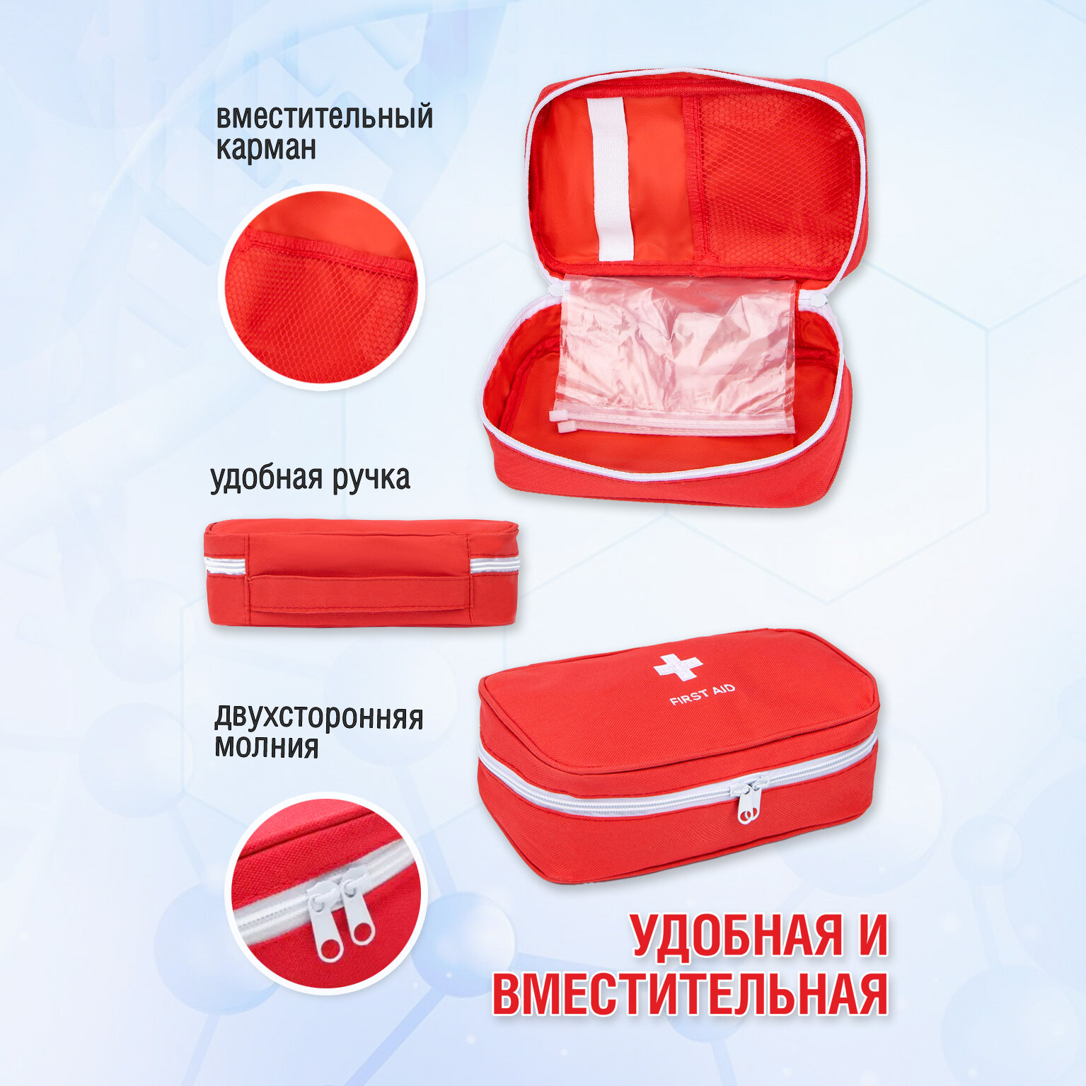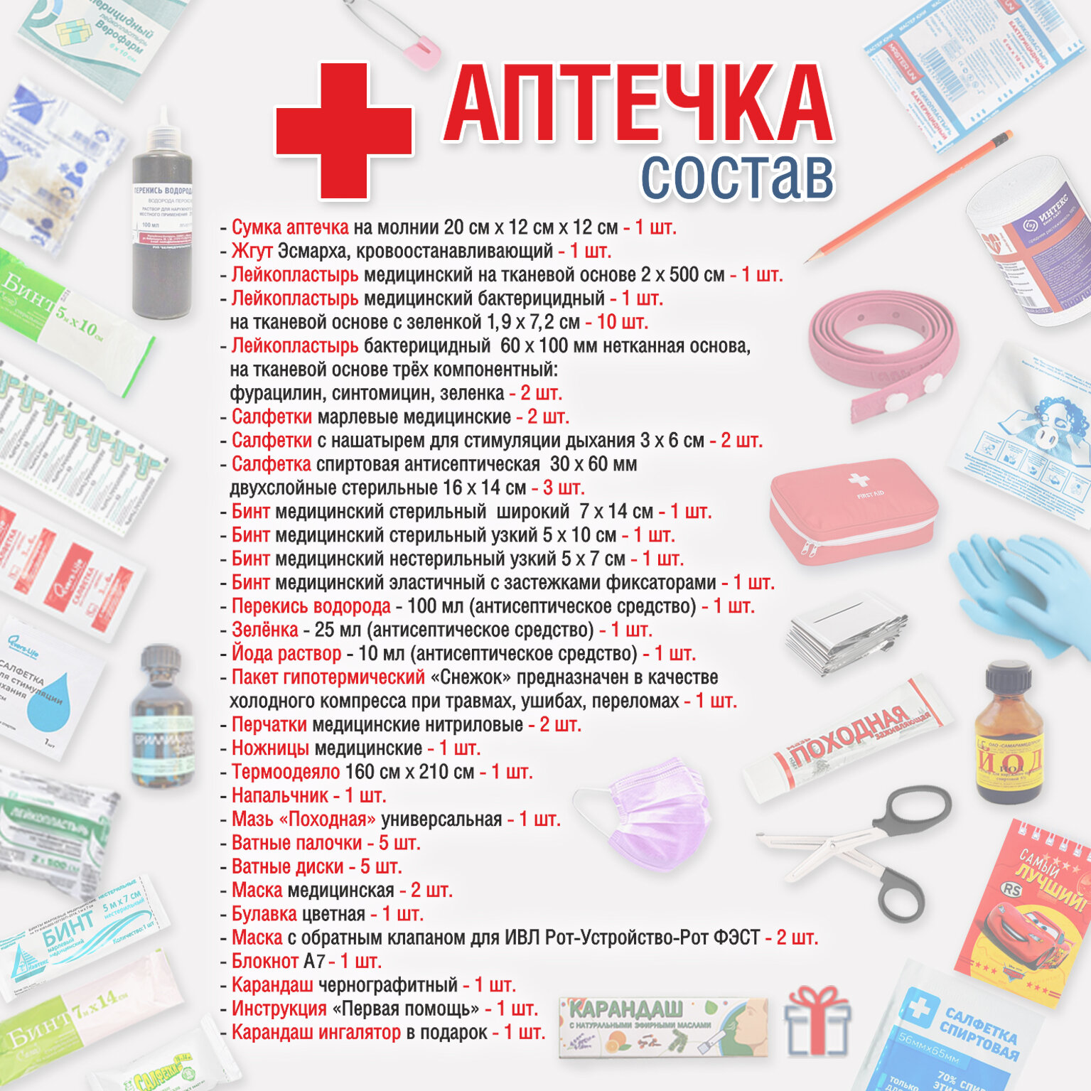 | Состав | 1- Сумка (аптечка); 2- Жгут кровоостанавливающий; 3- Пластырь рулонный 2х5м; 4- Пластырь одноразовый стерильный (10шт.); 5- Перекись водорода; 6- Лейкопластырь бактерицидный (2шт); 7- Салфетки марлевые; 8- Бинт широкий стерильный (7х14 см); 9- Бинт узкий стерильный (5х10 см); 10- Эластичный бинт; 11- Зеленка; 12- Йод; 13- Ватные диски (5 шт.); 14- Салфетка спиртовая антисептическая (30х60мм.); 15- Пакет гипотермический «Снежок»; 16- Маска медицинская (2 шт.); 17- Мазь ранозаживляющая; 18- Салфетка с нашатырным спиртом (2 шт.); 19-ножницы; 20- перчатки медицинские; 21- Ватные палочки – 10 шт.; 22- Маска для проведения процедуры искусственного дыхания "Рот-Устройство-Рот" ФЭСТ; 23- Аскорбиновая кислота в подарок |
