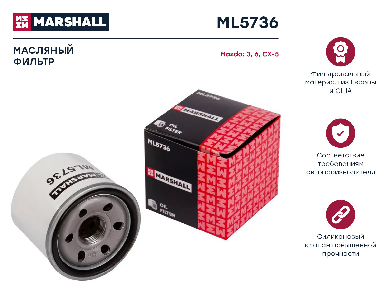MARSHALL ML5736 Фильтр масляный Mazda 3 (BM, BP) 13-, 6 (GJ, GL) 13-, CX-5 (KE, KF) 12- SkyActiv-G Marshall интересное: