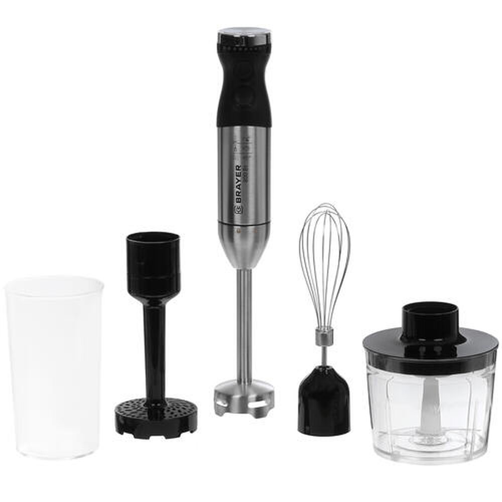 | Дополнительная информация | "Мощность 800 Вт Погружная часть и лезвия из нержавеющей стали Корпус из пластика, декорирован нержавеющей сталью Плавная регулировка скорости Насадка венчик для взбивания Стакан для смешивания 700 мл Насадка блендер для измельчения и смешивания Насадка измельчитель объемом 500 мл Электропитание 220 240 В, В,~ 50 60 Гц" |