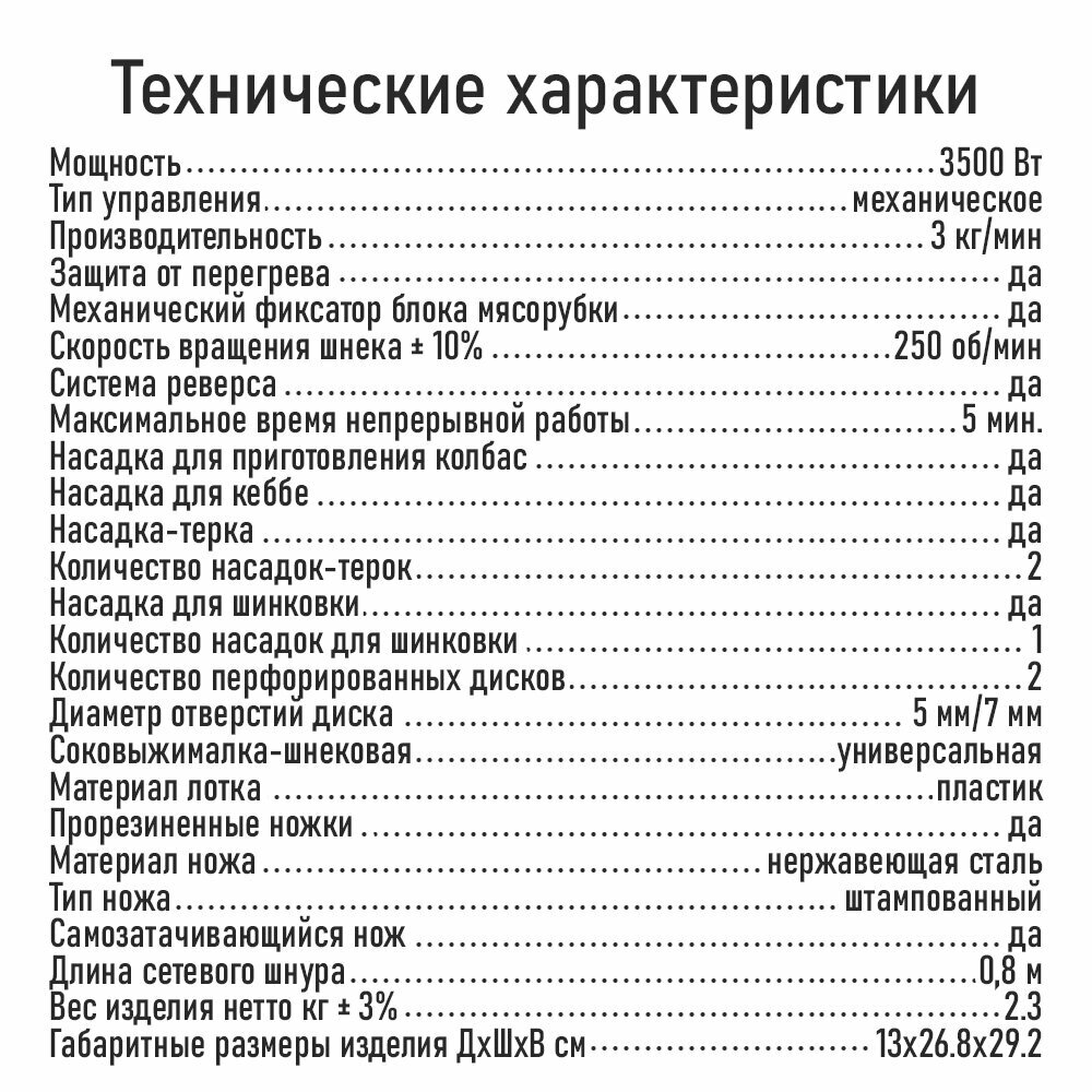 | Насадки | диск для фарша / насадка для кеббе / насадка для приготовления колбас / насадка для шинковки / насадка-терка / соковыжималка |