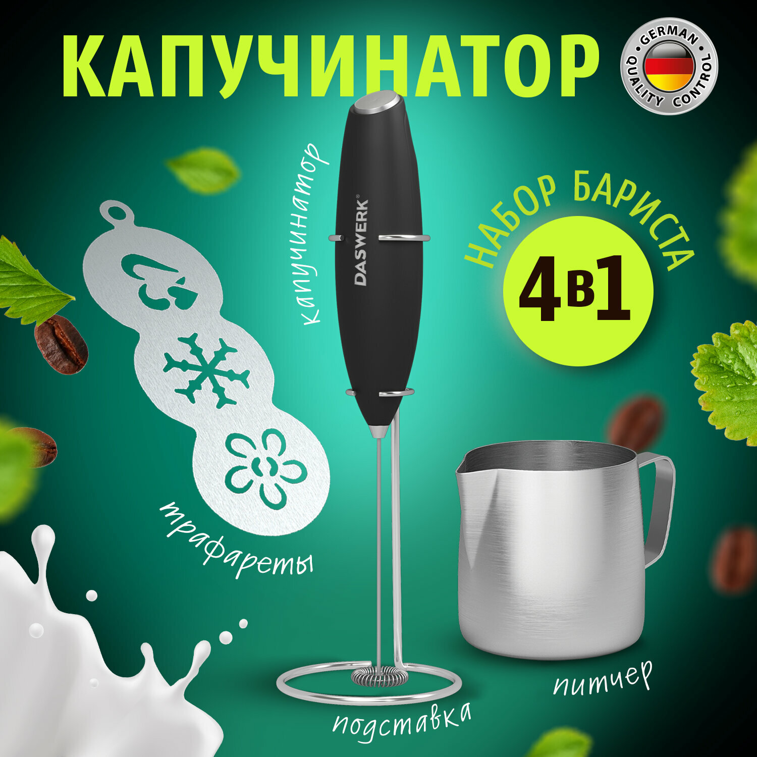 Капучинатор электрический, вспениватель молока для дома и кухни с подставкой, питчером, трафаретами 4 в 1, серебряный, Daswerk, 456182