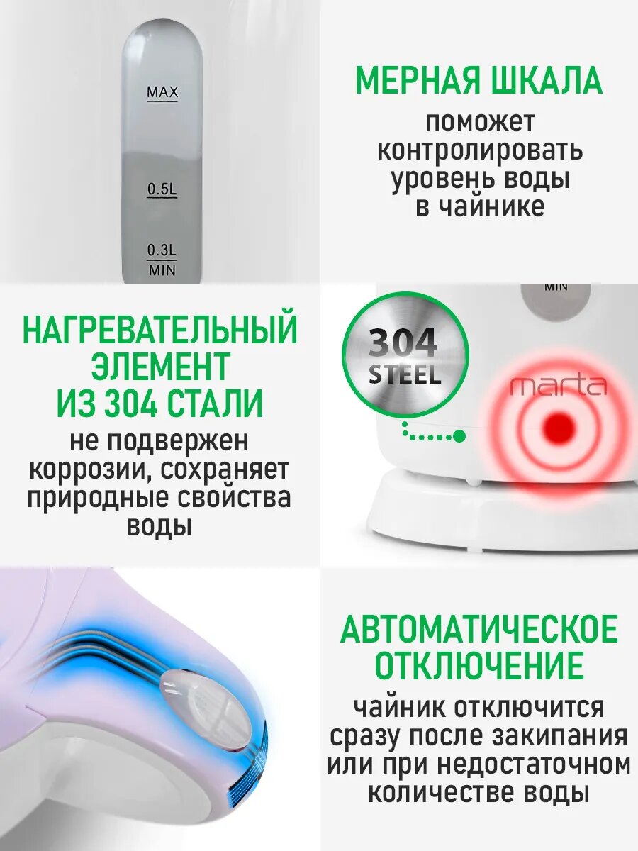 Электрический чайник MARTA MT-4608 ментол стеклянный с подсветкой, 1,8 л