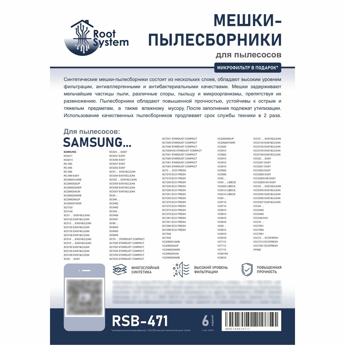 Мешки для пылесоса SAMSUNG, тип: VP-95, одноразовые синтетические пылесборники RootSystem SM2(6), комплект 5 шт. + фильтр интересное: