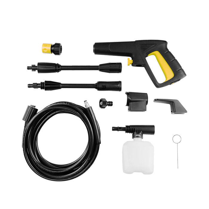 | Подробная комплектация | пистолет высокого давления, удлинитель, распылитель, емкость для моющих средств, переходник, быстросъем для шланга 3/4, гибкий шланг высокого давления, игла для очистки сопла |
