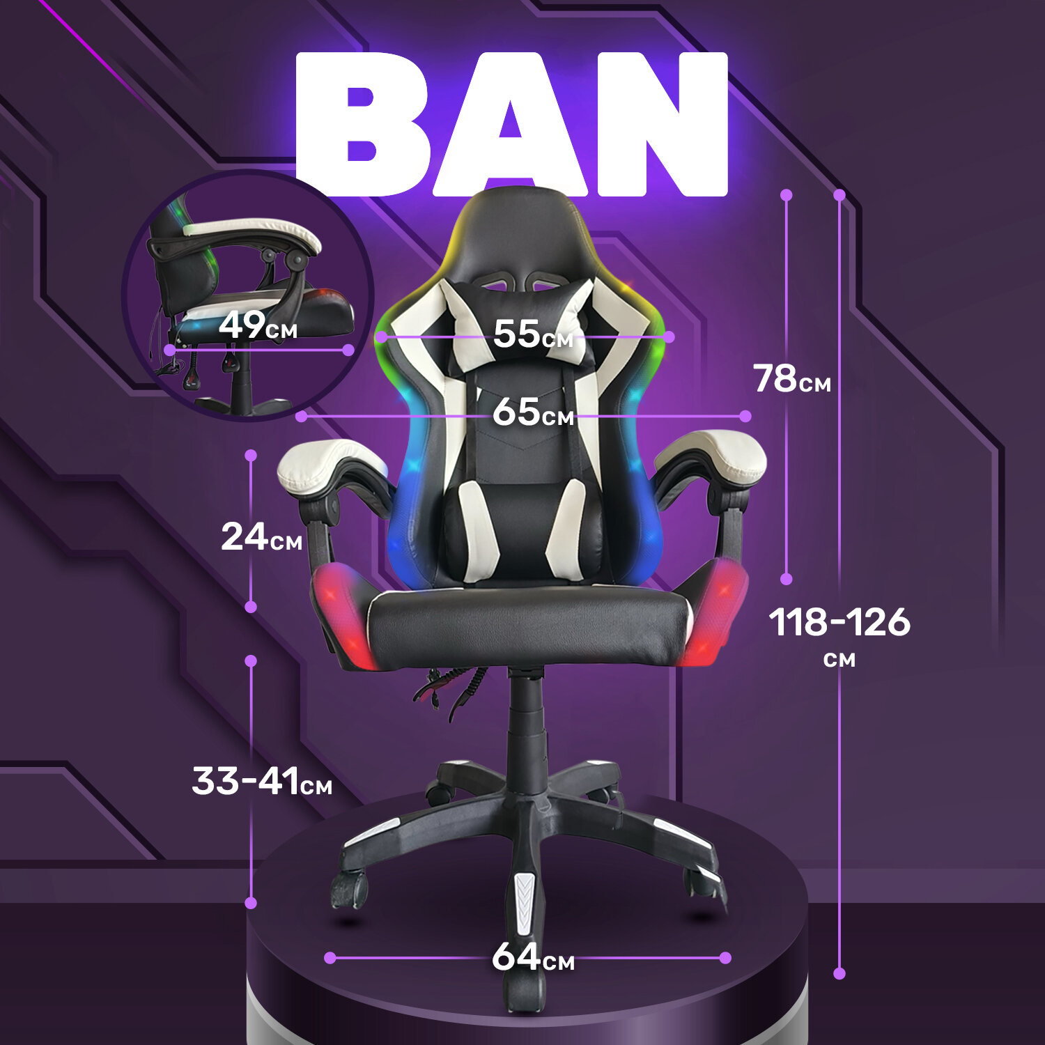 Купить Игровое геймерское кресло на колесиках BYROOM Game BAN RGB white HS-5010-W-RGB кожаное крутящееся. Компьютерный стул для геймера с ортопедической высокой спинкой для игр и работы на пк