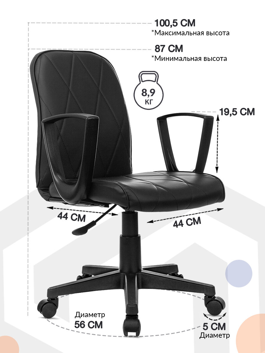| Дополнительная информация | Соответствует стандарту BIFMA. Вес кресла - 8,9 кг. Размеры: высота кресла - 87-100,5 см., высота сиденья - 44,5-58 см., ширина сиденья - 44 см., глубина сиденья - 44 см., высота спинки - 42,5 см., ширина спинки - 42 см., высота подлокотника - 19,5 см. |