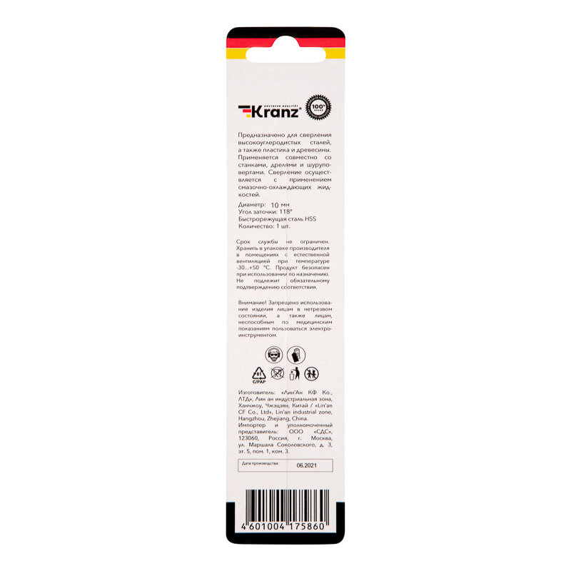 Сверло KRANZ по металлу 10 мм повышенной прочности с углом заточки 118 градусов HSS, 1 шт. в упаковке, DIN 338