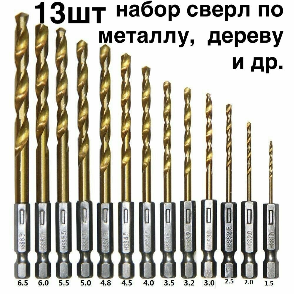 Купить 13шт! Набор сверл по металлу, дереву и др. диаметром от 1.5 до 6.5мм с шестигранным хвостовиком