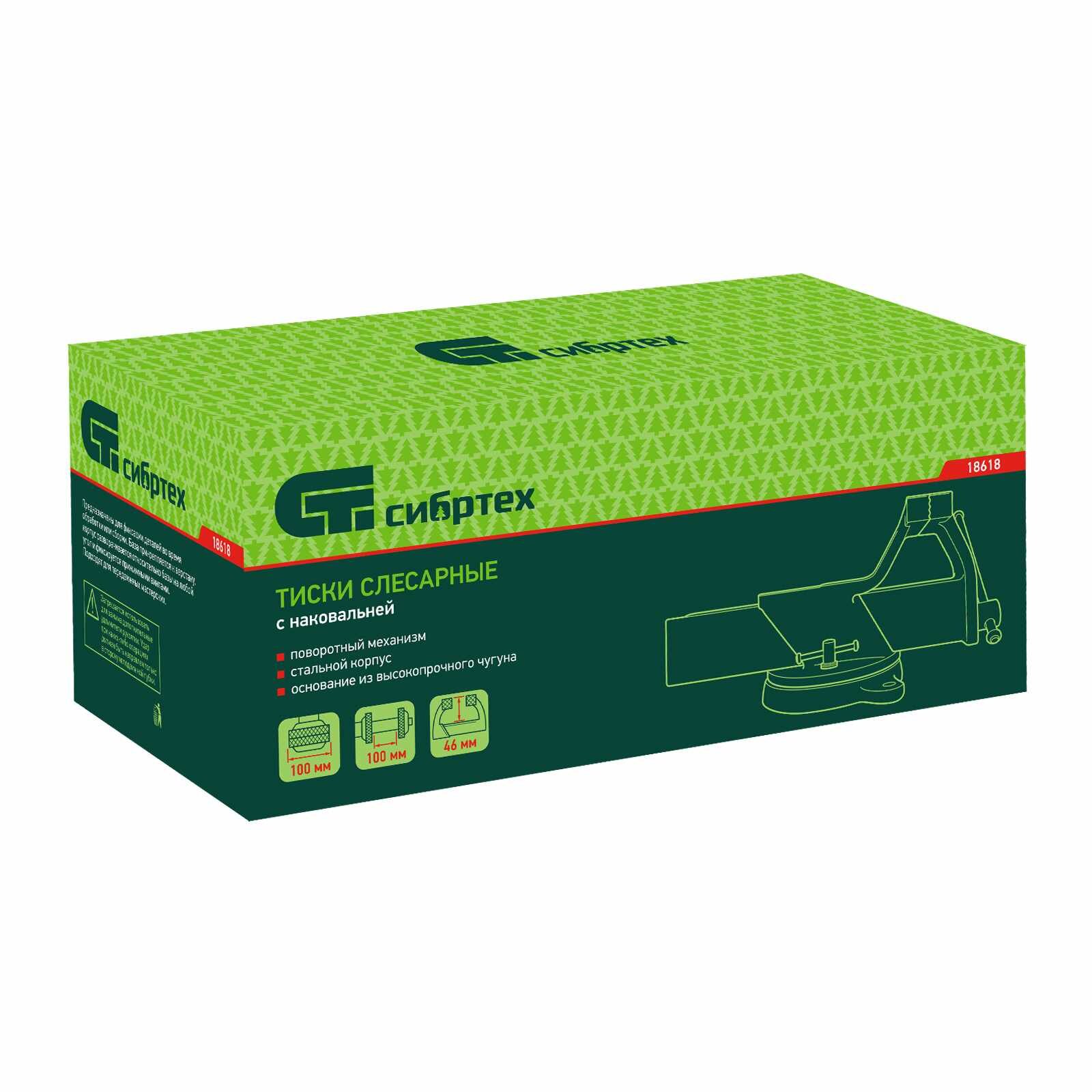 Тиски слесарные поворотные Сибртех, 100 мм ширина губок и 100 мм рабочий ход, стальной корпус и чугунное основание 18618