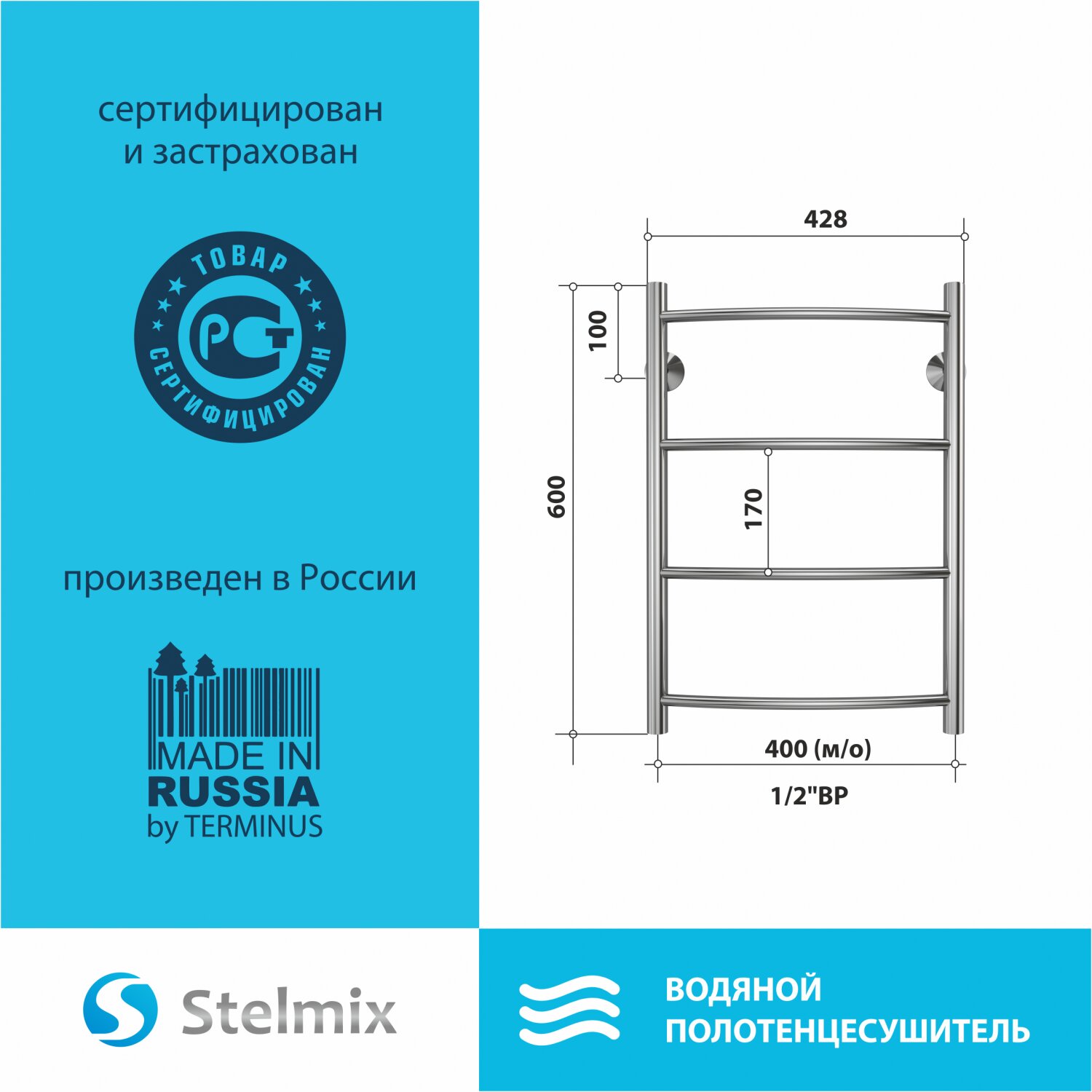 Полотенцесушитель водяной STELMIX (стелмикс) Дуга П4 400х600 мм, нижнее подключение, гарантия 5 лет