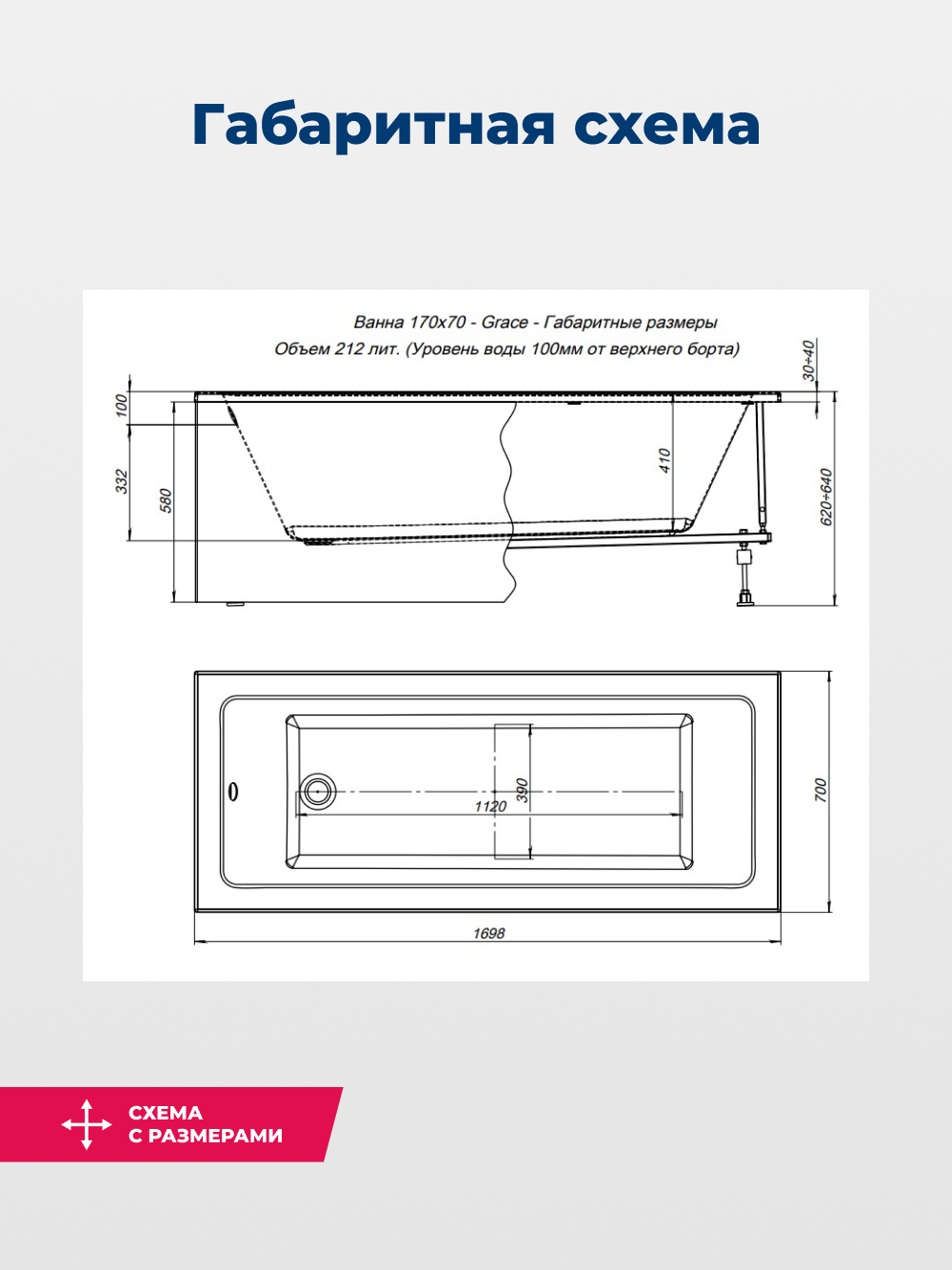 Акриловая ванна Aquanet Grace 170х70 на каркасе