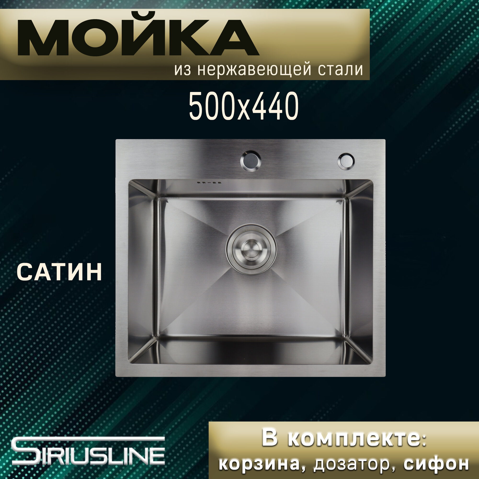 Мойка SIRIUSLINE Premium 50х50 из нержавеющей стали Сатин SL5050 (в комплекте с коландером, врезным дозатором, и сифоном) толщина стали 3 мм