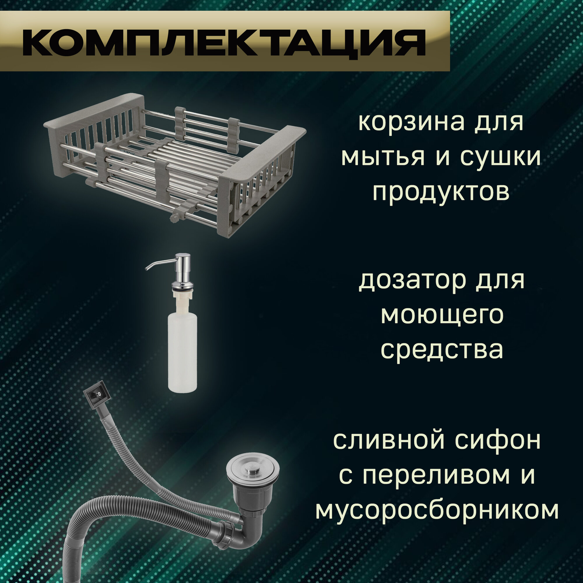 Мойка из нержавеющей стали SIRIUSLINE Premium 60х45 (в комплекте с коландером, врезным дозатором, и сифоном) толщина стали 3 мм