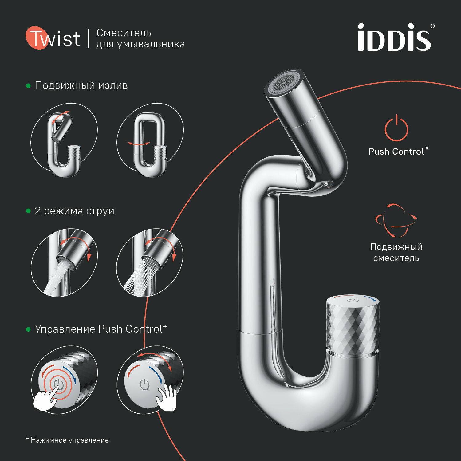 Смеситель для умывальника IDDIS Twist с управлением Push Control (TWISBBTi01)