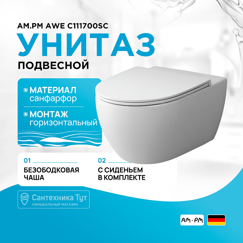 Унитаз подвесной Am.Pm Awe FlashClean безободковый, с сиденьем микролифт (C111700SC) интересное: