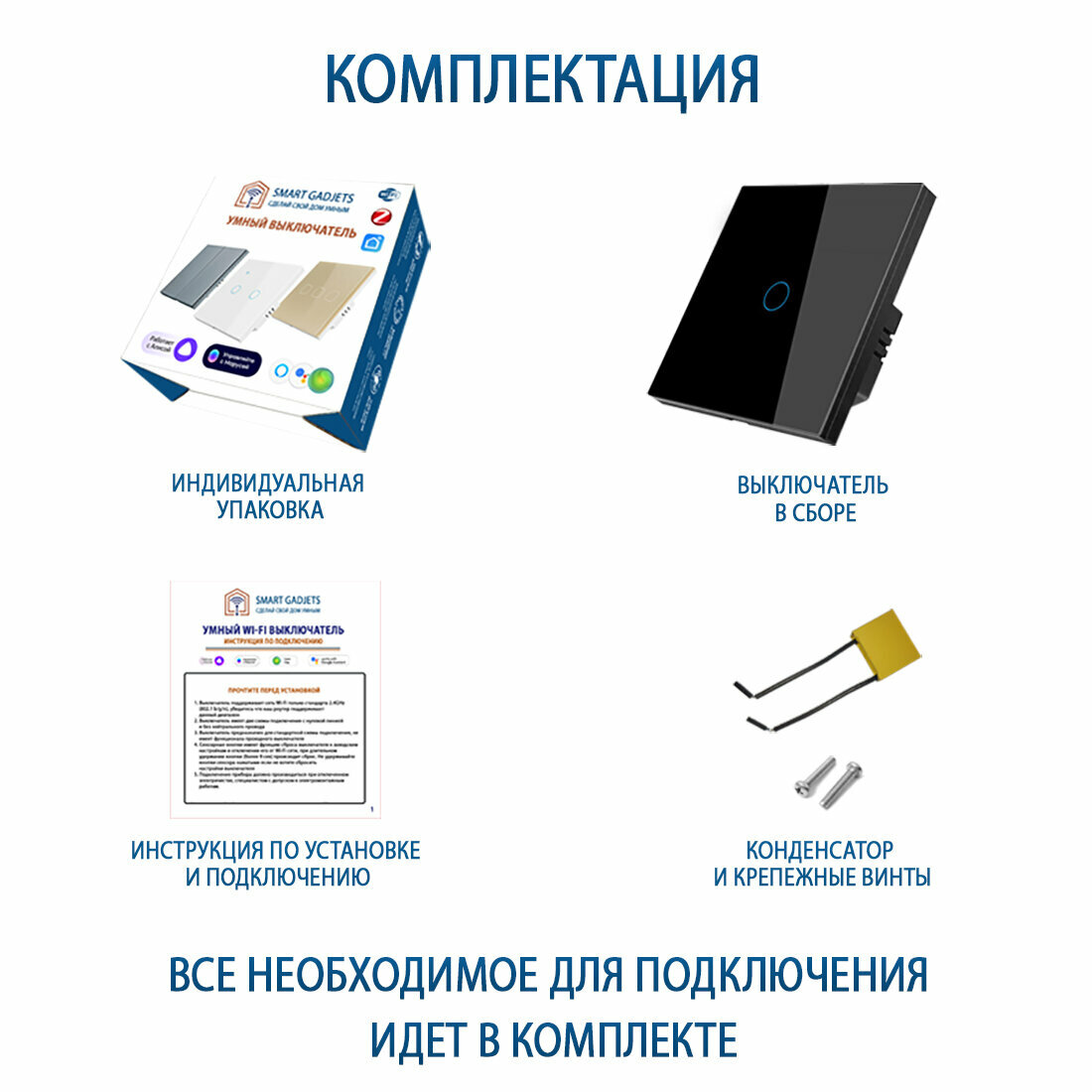 Умный выключатель с Алисой, сенсорный выключатель с Wi-Fi одноклавишный черный, подключение с нулем и без нуля, закаленное стекло