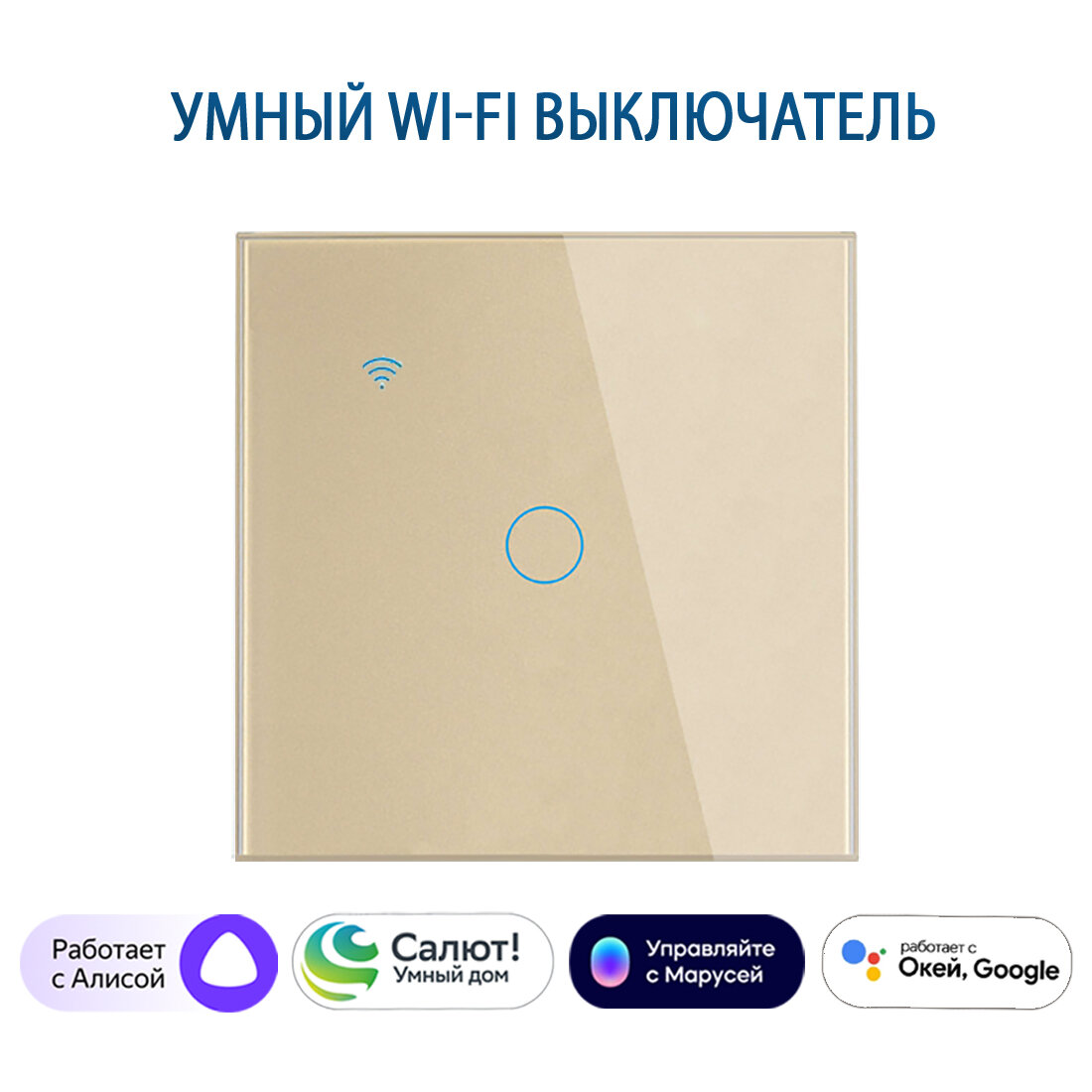 Умный выключатель с Алисой, сенсорный выключатель с Wi-Fi одноклавишный золотой, подключение с нулем и без нуля, закаленное стекло