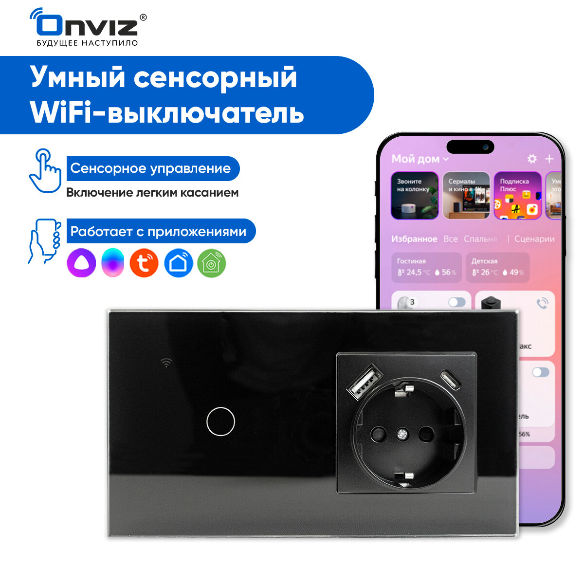 Купить Умный сенсорный Wi-Fi выключатель с Алисой (черный) 1клавишный с розеткой USB Type-C, универсальный без нуля и с нулем