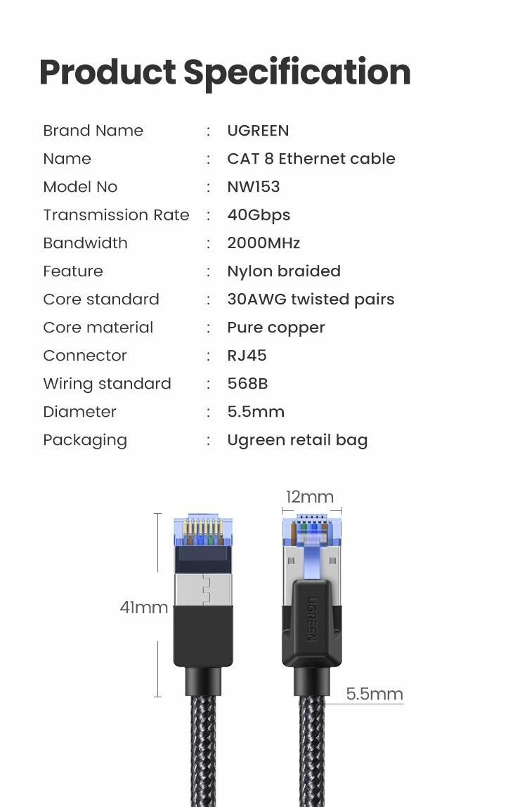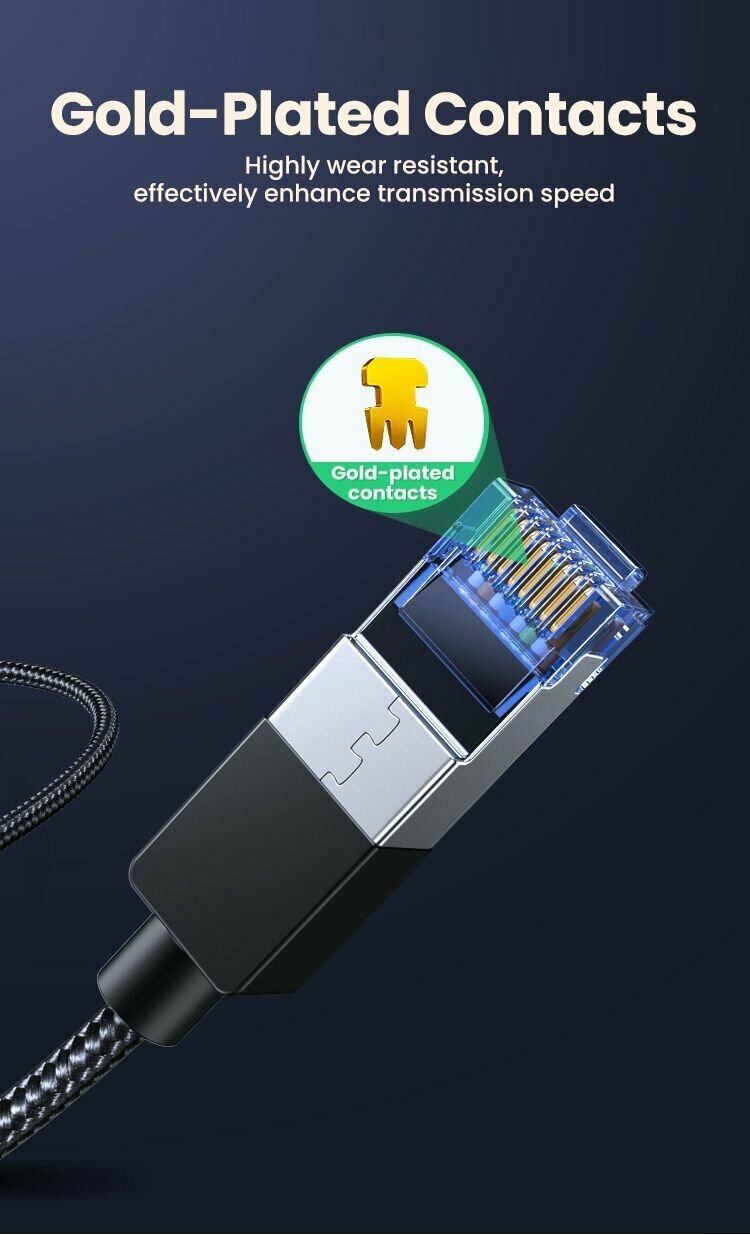 Кабель UGREEN Cat8 F/FTP Pure Copper Ethernet Cable Round Braided OD5.5mm 5m (Black) 80433