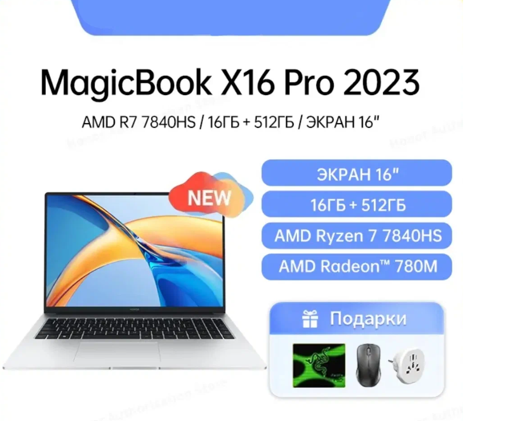 | Дополнительная информация | 16" Ноутбук Honor MagicBook X16 Pro (5301AGPH), AMD Ryzen 7 7840HS (3.8 ГГц), RAM 16 ГБ, SSD 512gb, AMD Radeon 780M, Windows 11 Pro, серебристый, Российская клавиатура |