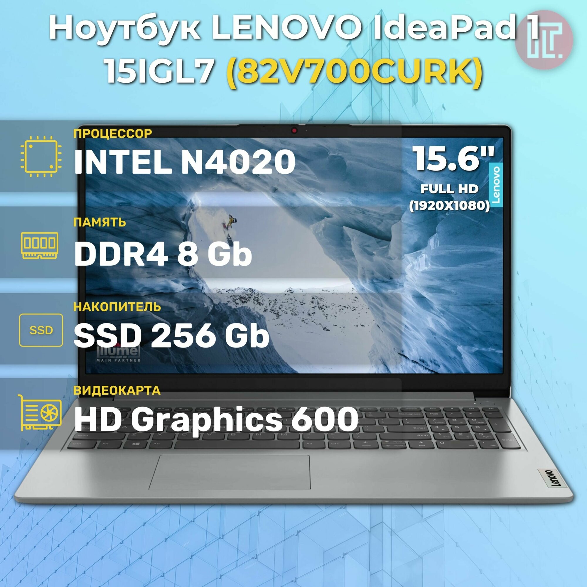 Купить Ноутбук Lenovo IdeaPad 1 15IGL7 82V700CURK, 15.6", 2023, IPS, Intel Celeron N4020 1.1ГГц, 2-ядерный, 8ГБ DDR4, 256ГБ SSD, Intel UHD Graphics 600, без операционной системы, серый