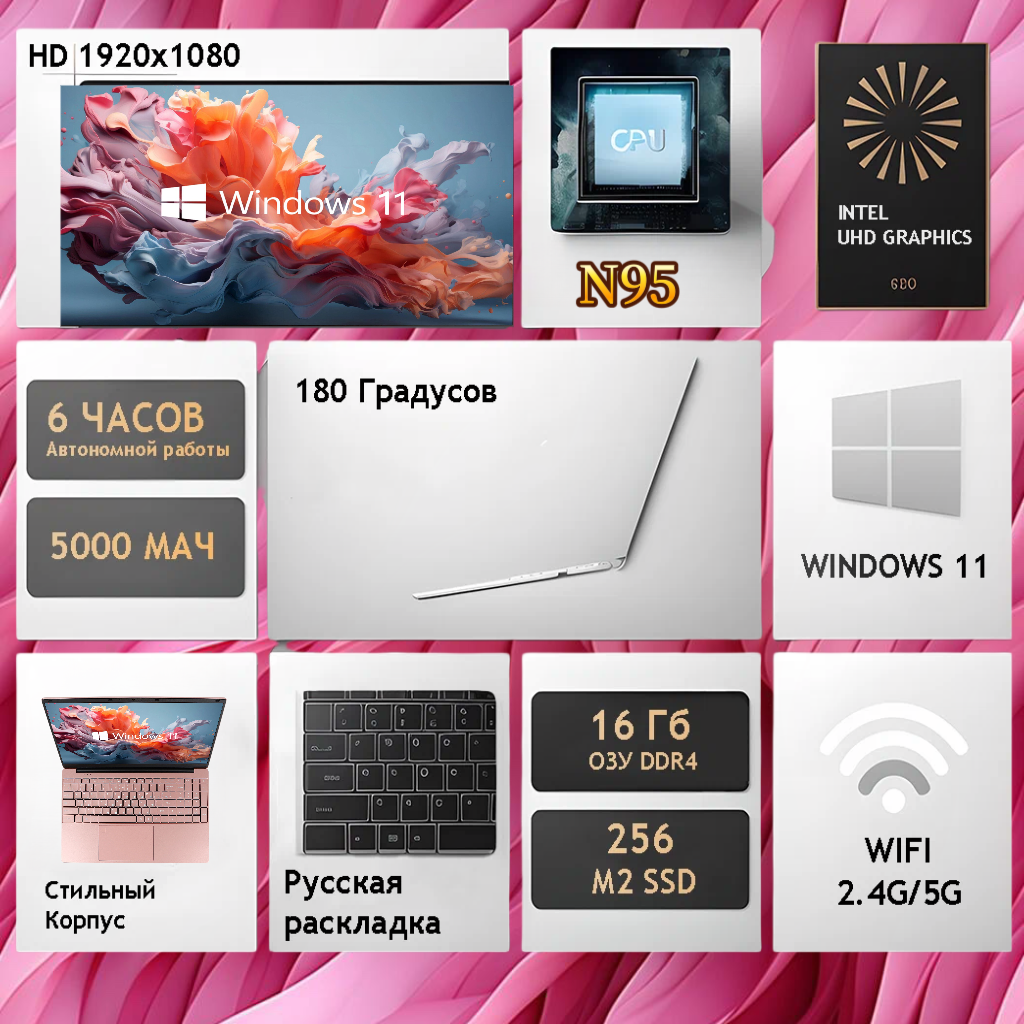 Ноутбук 15.6", Intel N95 (3.4 ГГц), RAM 16 ГБ, SSD 256 ГБ, Intel UHD Graphics, Windows 11 ProРозовый подарок, Русская раскладкаСтуденческие игры ноутбуки, Студенческие игры ноутбуки, рабочие ноутбуки,