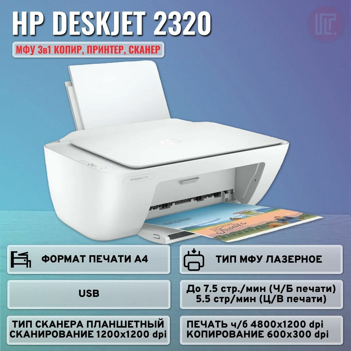 Купить МФУ струйный цветной, HP Deskjet 2320, принтер 3 в 1, цветная печать, A4, 4800x1200 dpi, ч/б - 7.5 стр/мин (А4), USB