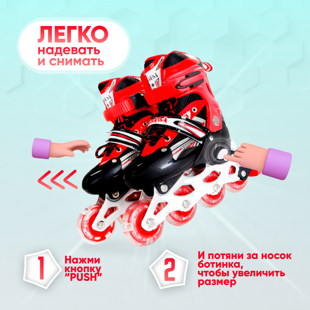 | Особенности | вентилирующие элементы, верхняя бакля, защита в комплекте, коньки-ролики, раздвижные, с тормозом, светоотражающие элементы, светящиеся колеса, сумка-переноска в комплекте, съемный внутренник, шлем в комплекте |