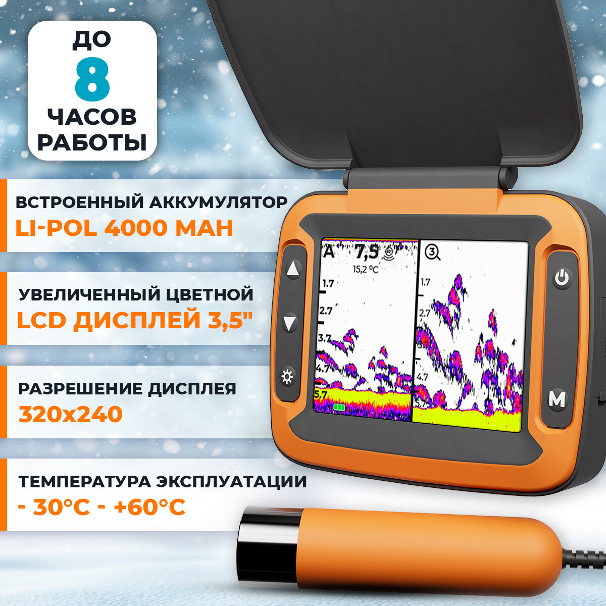 | Дополнительная информация | Тип дисплея: LCD цветной; Время работы эхолота от одной зарядки: 8 ч; Диапазон температур эксплуатации: -30 °C - + 60 °C; Встроенная аккумуляторная батарея: LiPo 4000 mAh; Размер электронного блока: 107х95х38 мм. |