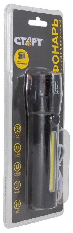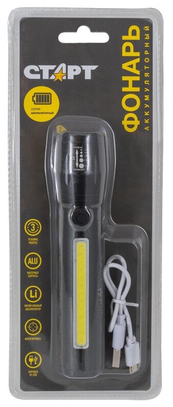 | Дополнительная информация | время зарядки аккумулятора: 3 ч; подробная комплектация: Фонарь, кабель USB; количество режимов работы: 3; потребление питания: от USB |