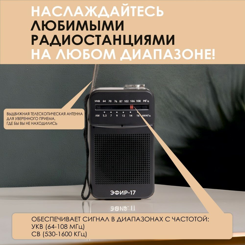 Радиоприёмник портативный ЭФИР-17 УКВ 64-108МГц, СВ 530-1600КГц, КВ