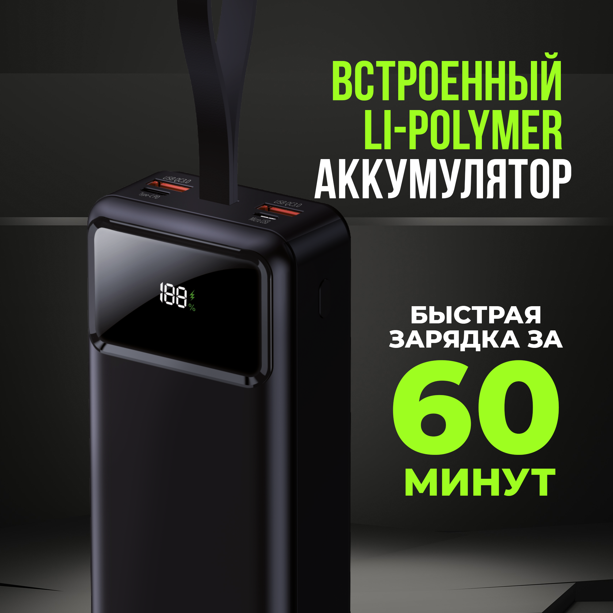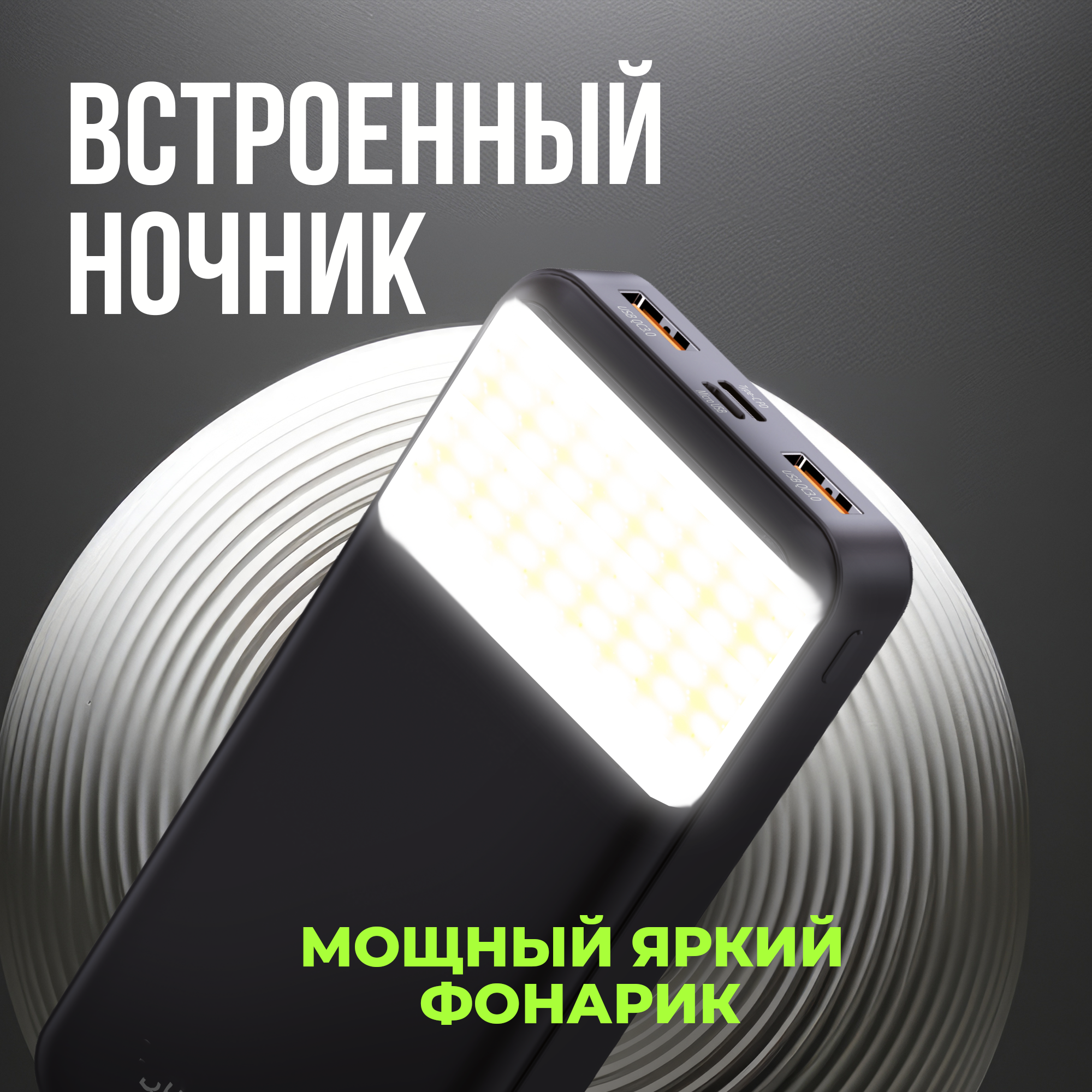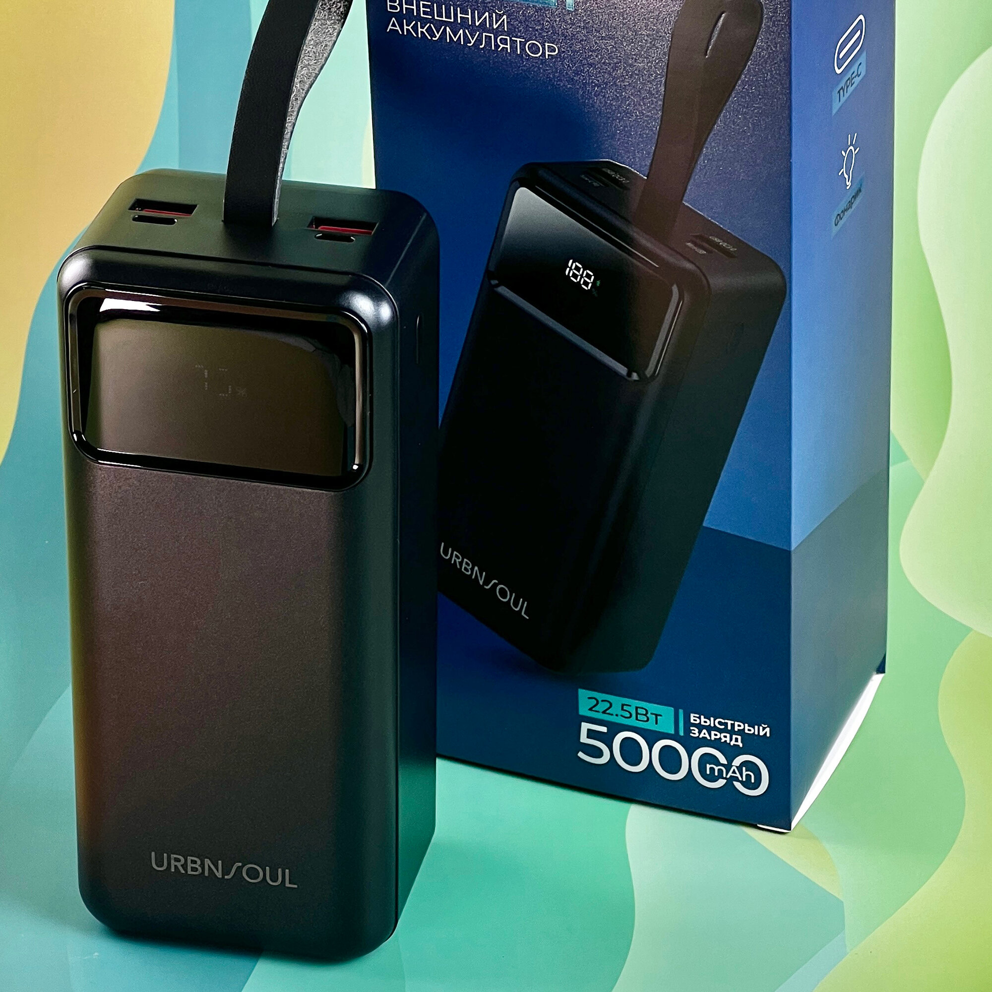 Повербанк с фонарем, 50000 mAh, 2 USB и Type-C, powerbank для айфона, портативный внешний аккумулятор для xiaomi, черный интересное: