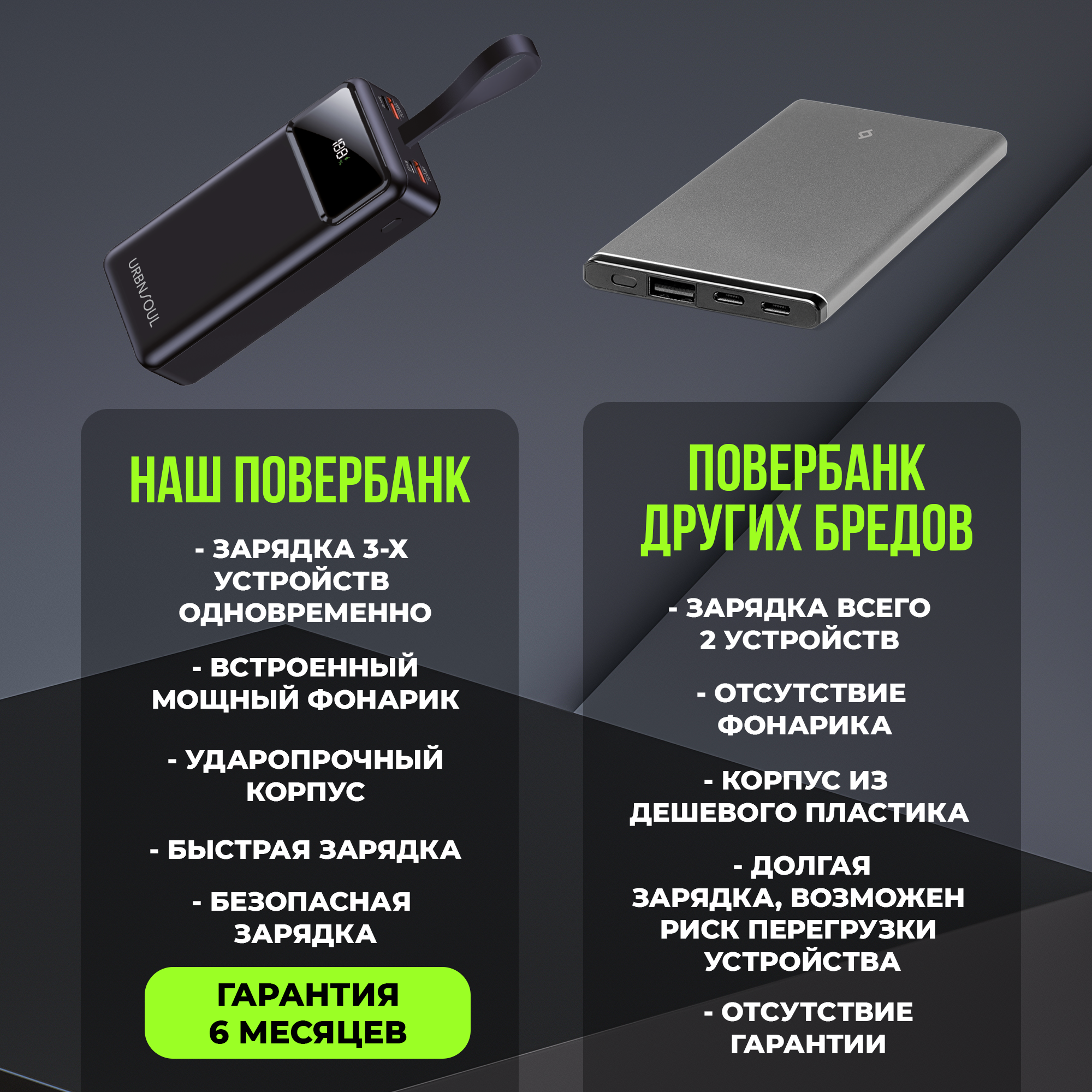 | Особенности | зарядка двух устройств / индикатор заряда / фонарик |
