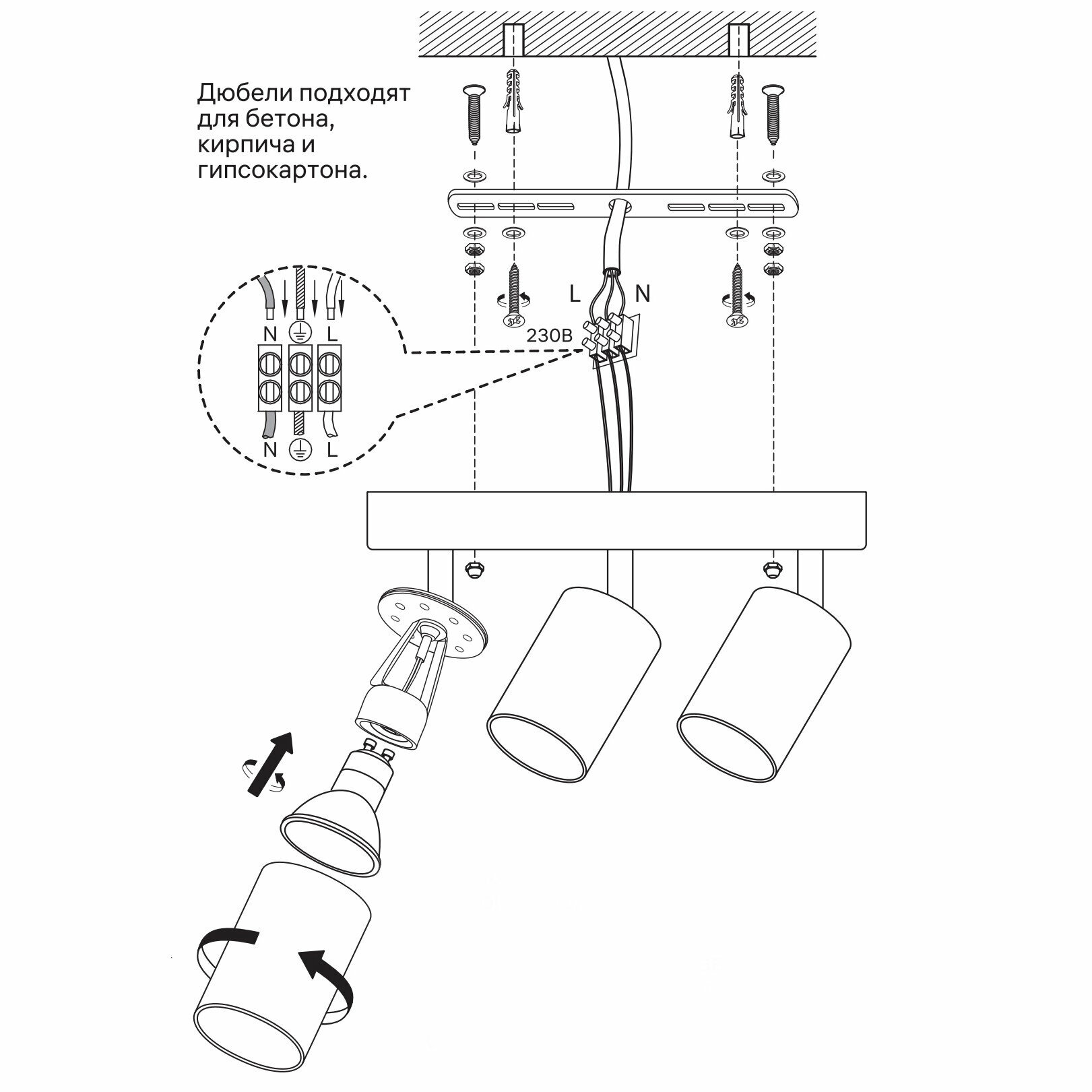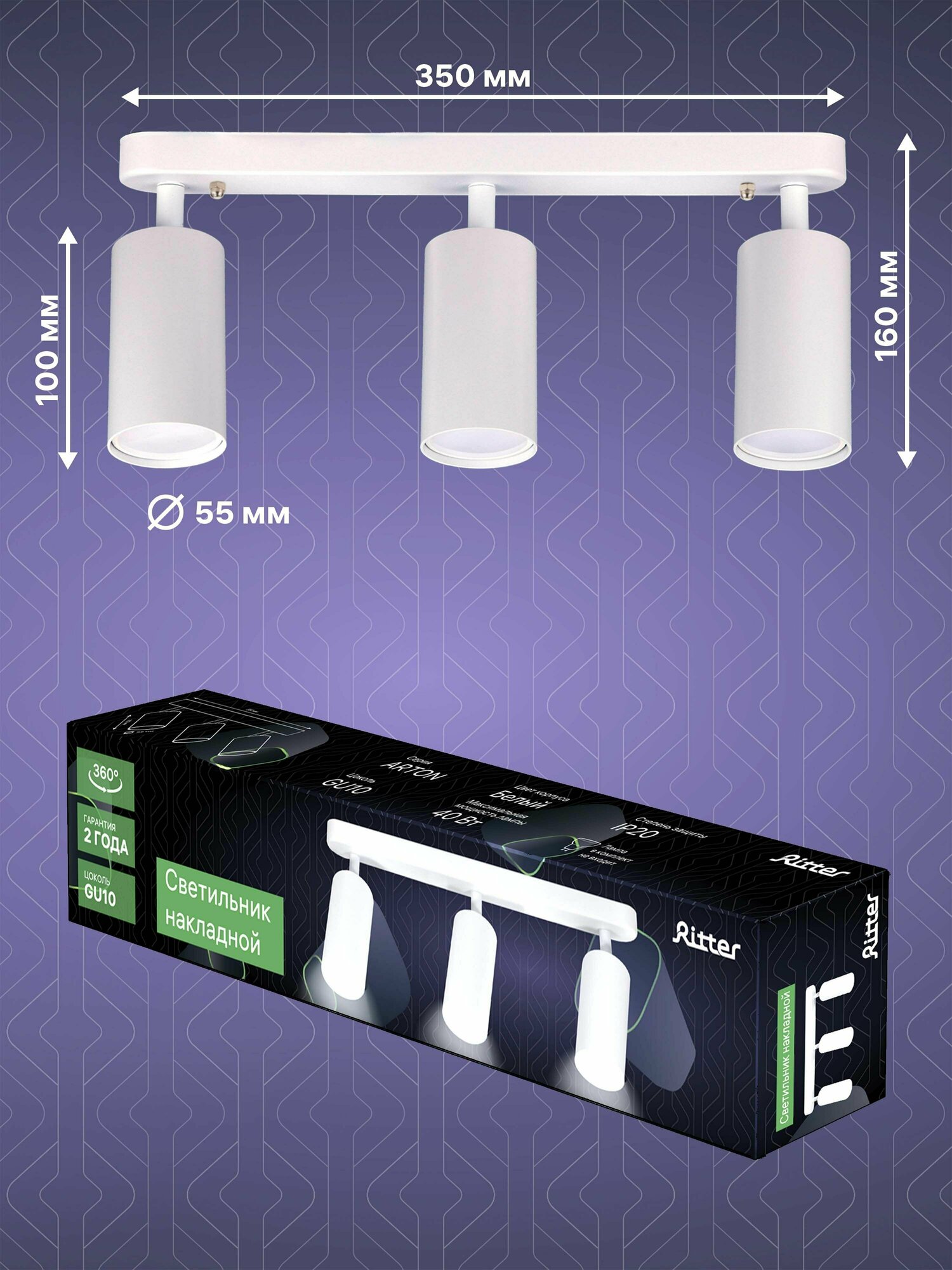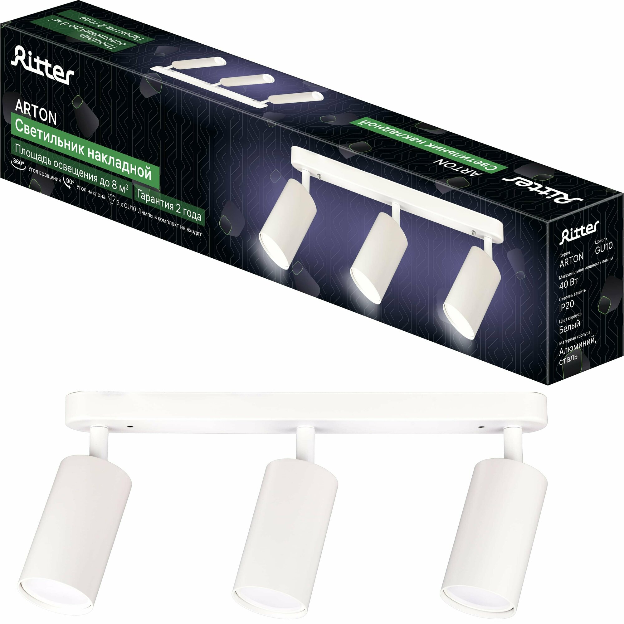 Светильник накладной Arton, поворотный, цилиндр, алюминий, 55х100х350мм, 3хGU10, белый, настенно-потолочный светильник для гостиной, Ritter, 59990 6