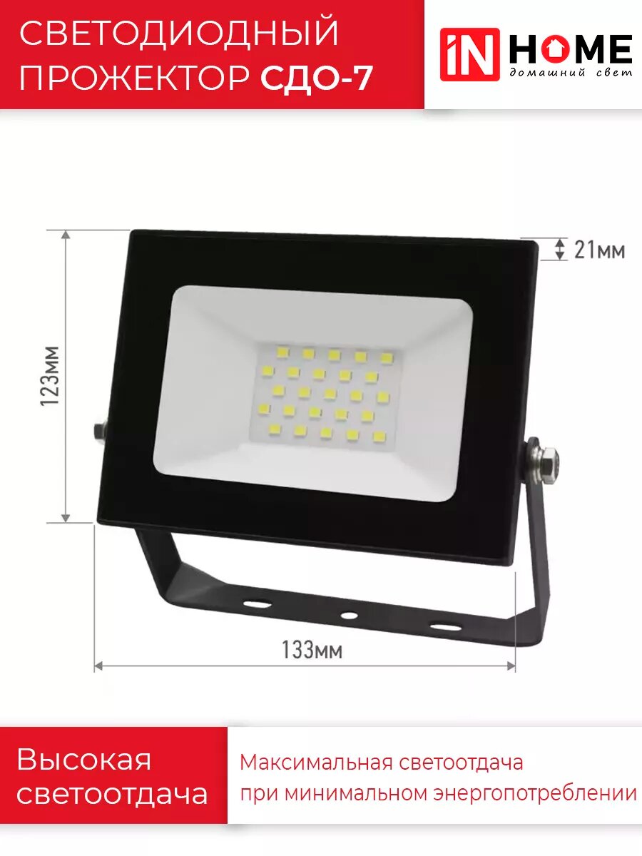 Прожектор диодный 20Вт СДО-7, IP65, 6500K, белый, In Home 4690612034683