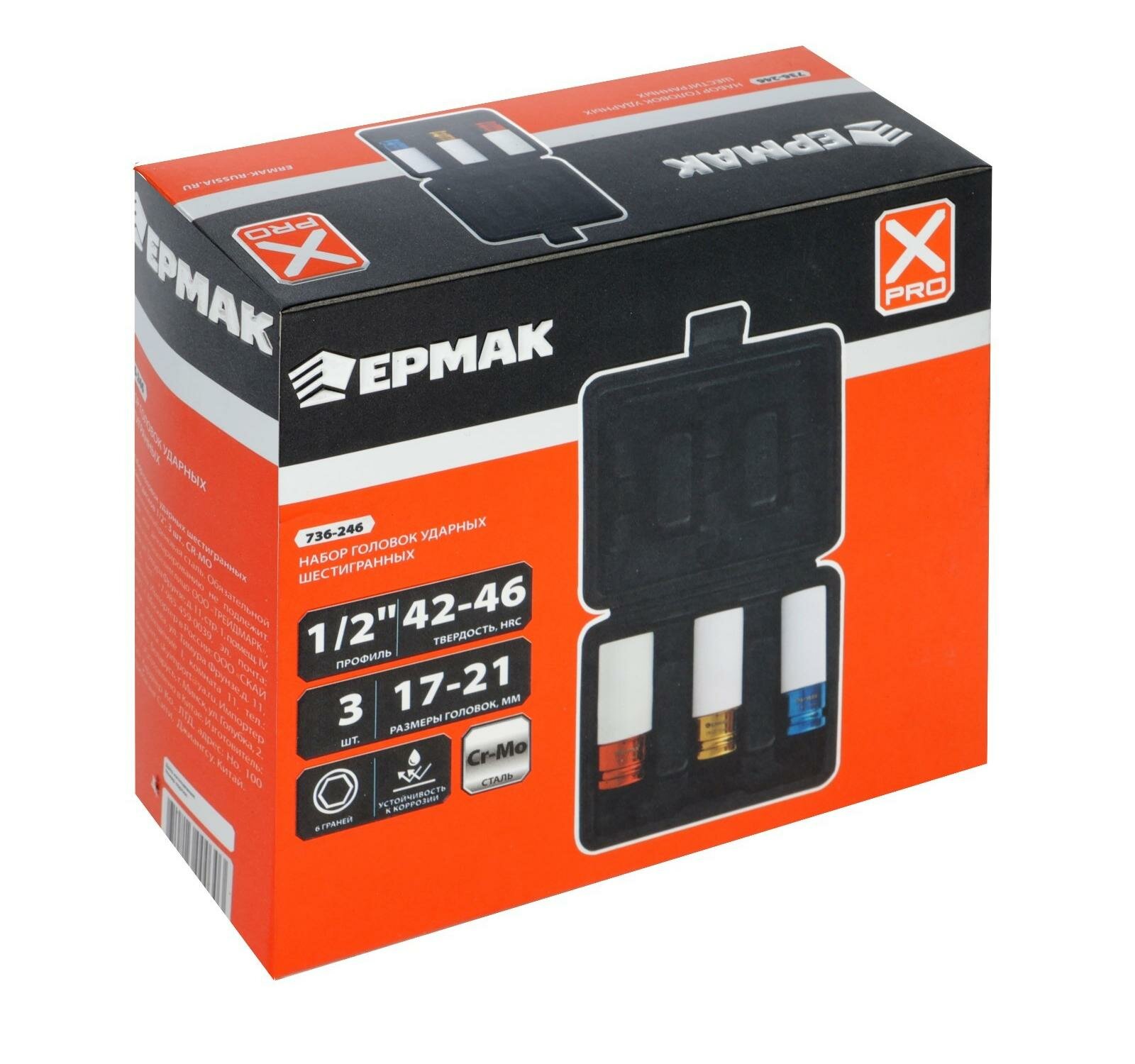 Набор головок для колесных дисков ермак 736-246, ударные, шестигранные, 1/2", 17/19/21 мм