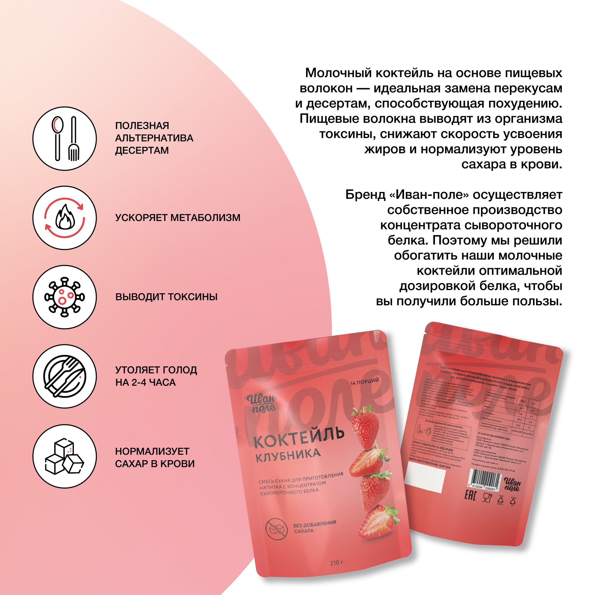 Молочный коктейль Иван-поле Клубника, протеиновый для снижения веса, 210 г/14 порций