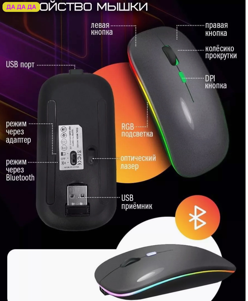 СохранитьМышь беспроводная компьютерная аккумуляторная / 3 режима DPI (800/1200/1600) Bluetooth + USB 2.4Ghz / RGB подсветка / Серый интересное: