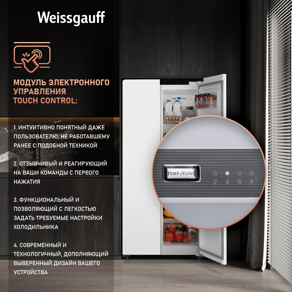 Купить Отдельностоящий холодильник с инвертором и подачей воды Weissgauff WSBS 600 W NoFrost Inverter Water Dispenser Side by Side двухдверный, 3 года гарантии, Мощность замораживания 12 кг сутки, Объём 500 л, Сенсорное управление, Суперзаморозка, A+