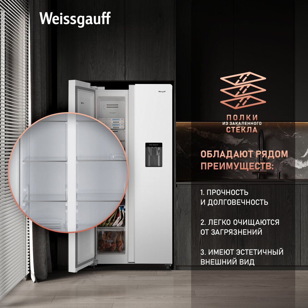 СохранитьОтдельностоящий холодильник с инвертором и подачей воды Weissgauff WSBS 600 W NoFrost Inverter Water Dispenser Side by Side двухдверный, 3 года гарантии, Мощность замораживания 12 кг сутки, Объём 500 л, Сенсорное управление, Суперзаморозка, A+ интересное: